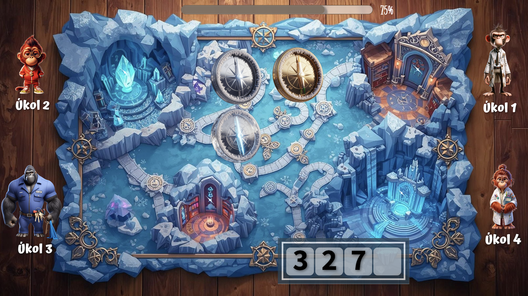 Až po splnění úkolu se “odemkne” další. Žák sbírá náhodně generované kódy a také odměny - kompasy. Upozorněte žáky, že na každý kompas je potřeba po splnění úkolu a získání kódu kliknout a tím se “uloží” na mapu. Pokud se tak nestane, nemá to vliv na dokončení hry.