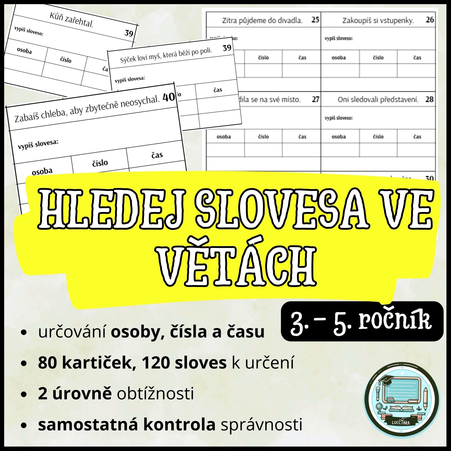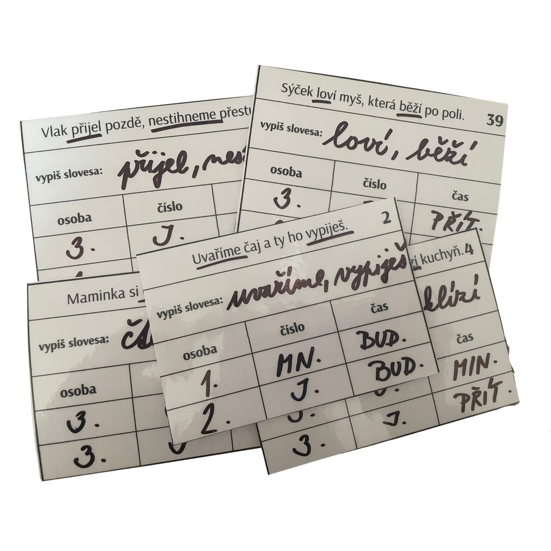 - 40 kartiček se souvětími se dvěma slovesy a řešením