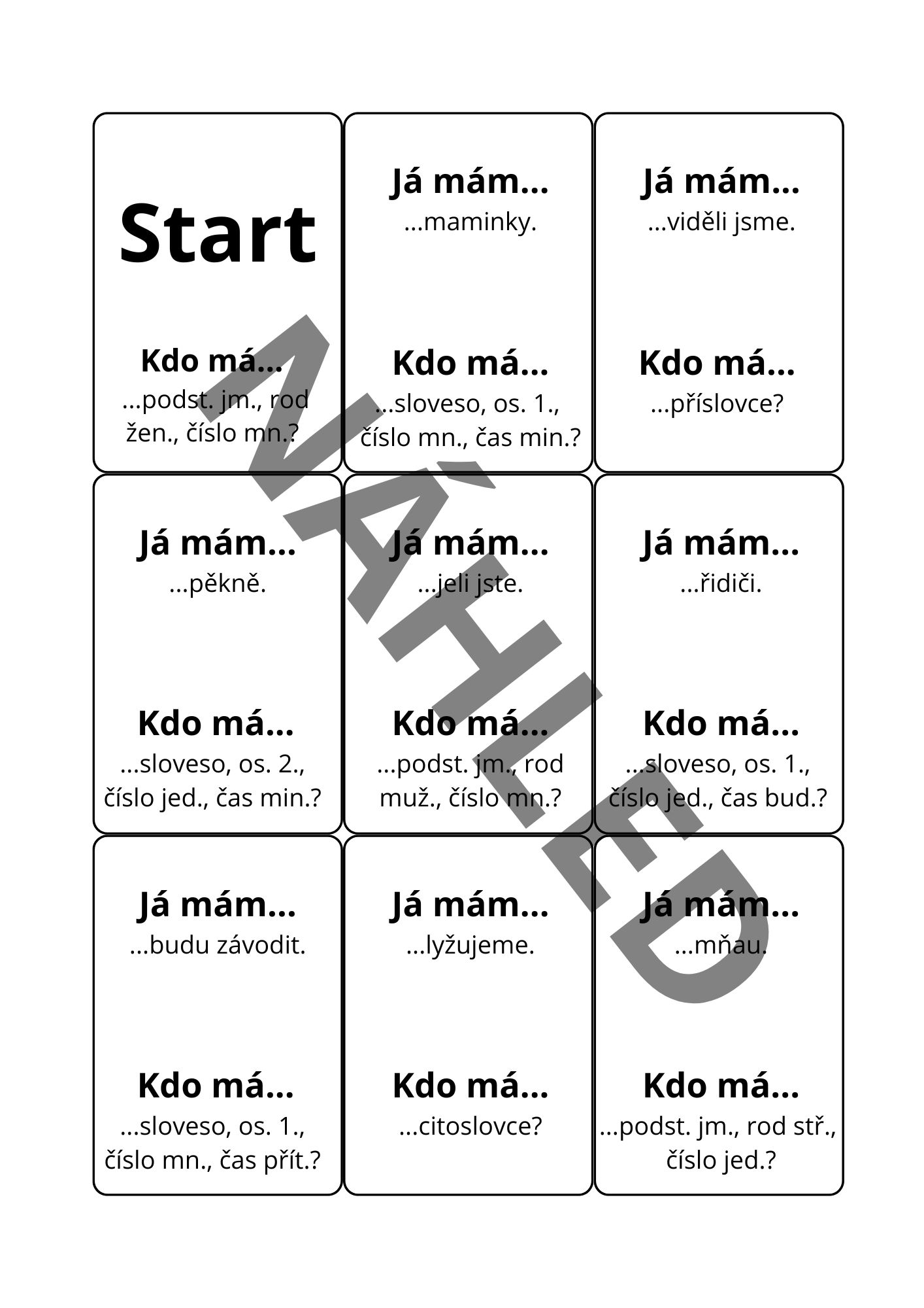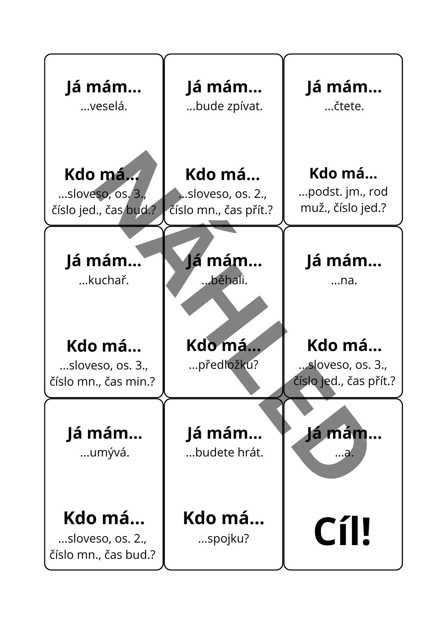 Děti si procvičí zejména mluvnické kategorie sloves a podstatných jmen, na dalších kartách si připomenou, co jsou přídavná jména, zájmena, číslovky, příslovce, předložky, spojky a citoslovce. Hra je vhodná pro zařazení ve 4. a 5. ročníku, případně koncem 3. třídy.