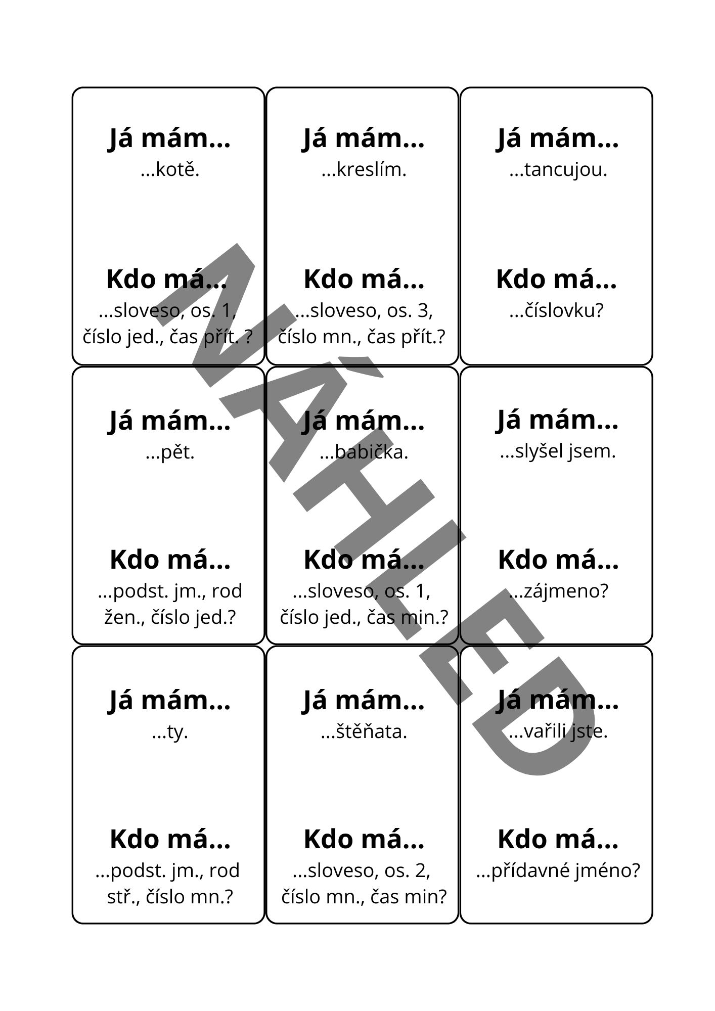 Karty jsou zaměřené především na mluvnické kategorie. Většina otázek ,,kdo má" zadává rod a číslo podstatného jména nebo osobu, číslo a čas slovesa. Zbývající karty hledají přídavné jméno, zájmeno, číslovku, příslovce, předložku, spojku a citoslovce. Ke kartám vždy patří konkrétní slovo odpovídající zadání, např. podstatné jméno, rod ženský, číslo jednotné -> babička; sloveso, 1. osoba, číslo jednotné, čas minulý -> slyšel jsem; citoslovce -> mňau apod.