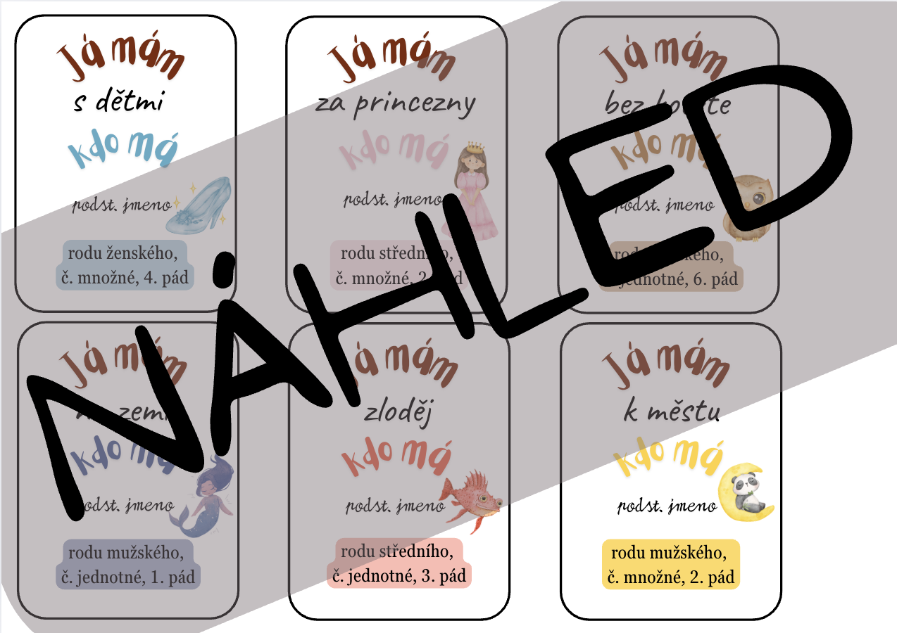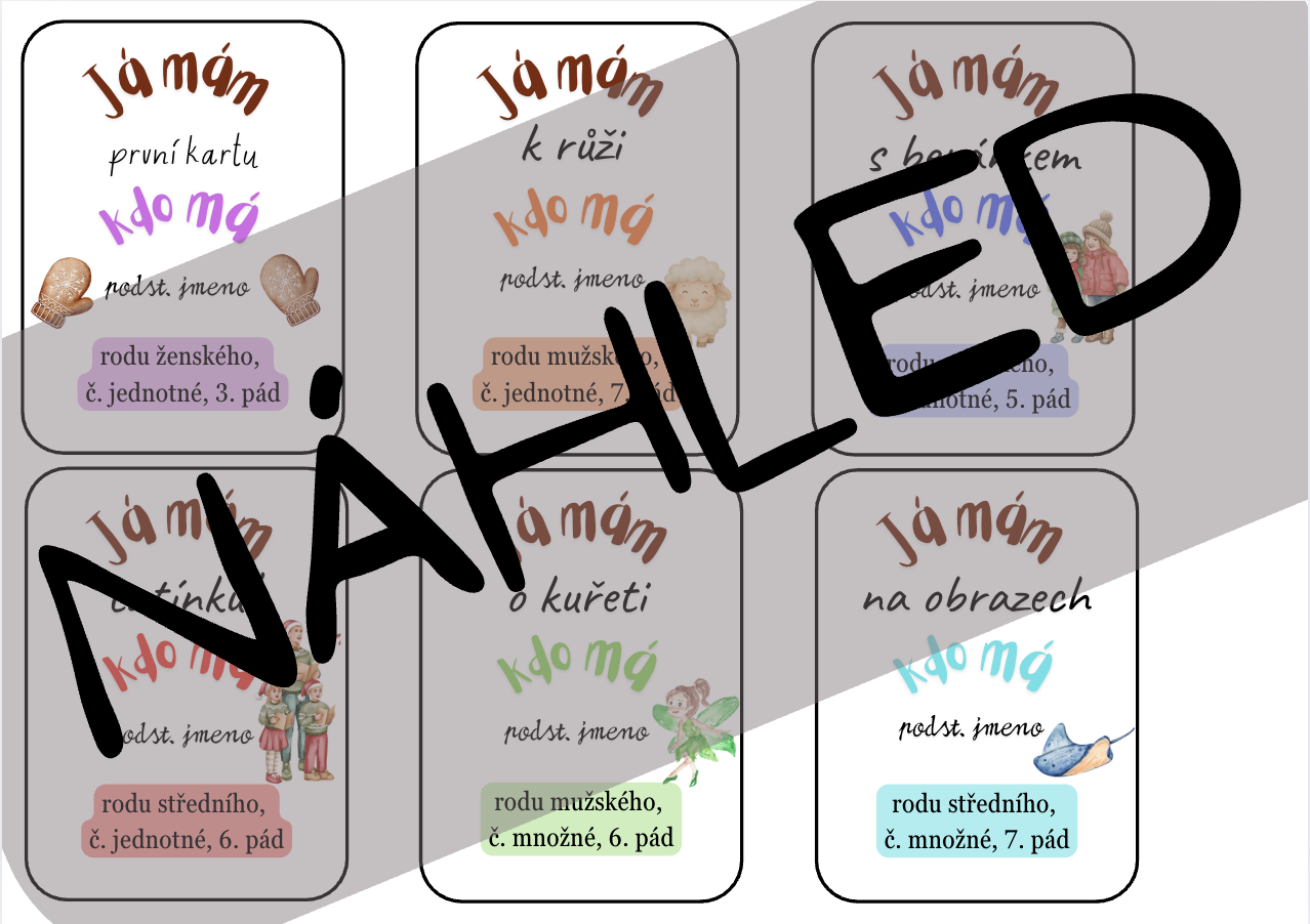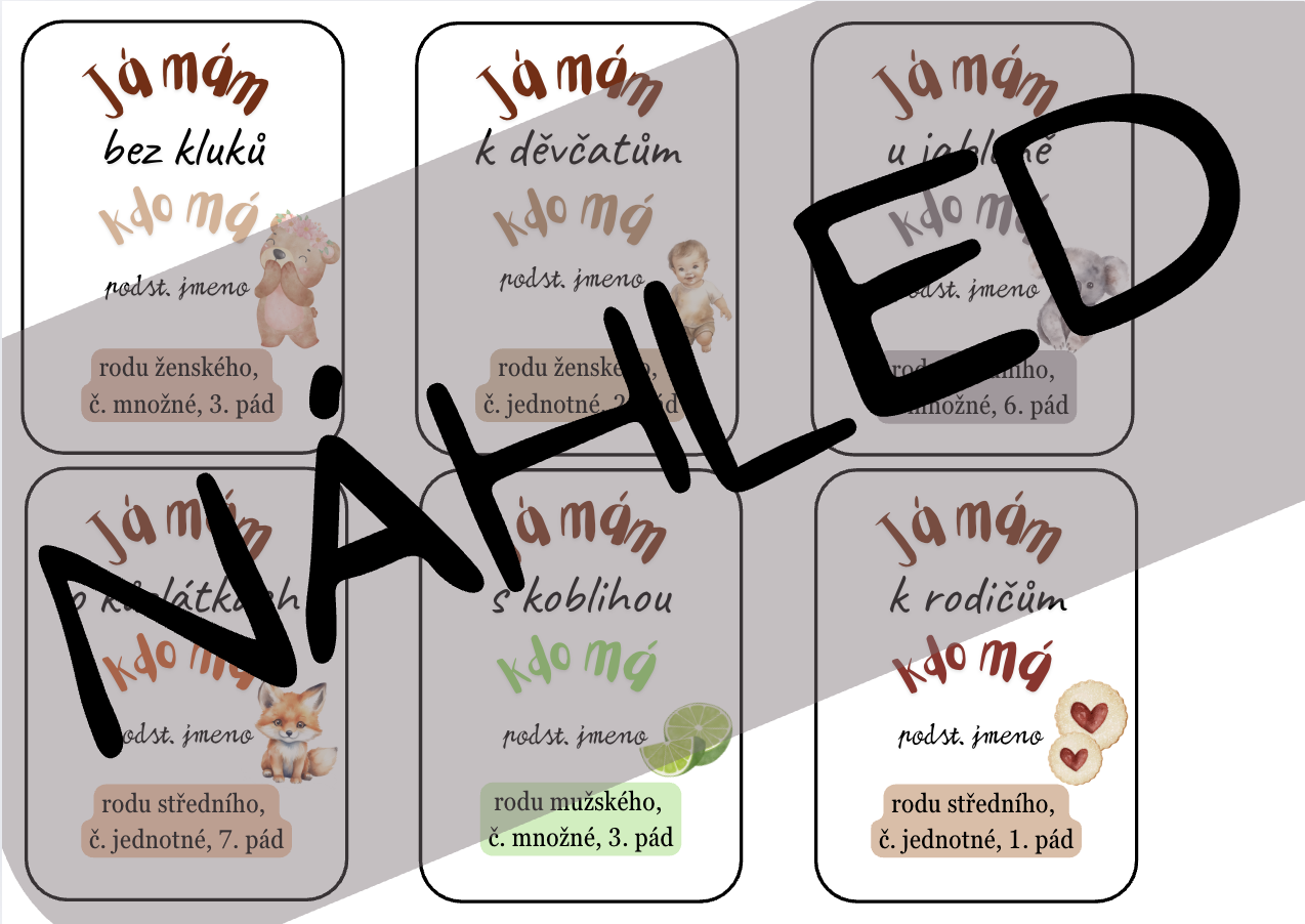 Každé dítě obdrží jednu kartu. Hru zahajuje dítě, které má kartu s textem: „Já mám první kartu…“ a položí otázku:„Kdo má podstatné jméno rodu ženského, čísla jednotného, ve 3. pádě?“ Dítě, které má kartu se slovem „k růži“, odpoví, přečte svůj text a následně položí další otázku stejným způsobem, například: „Kdo má podstatné jméno rodu mužského, čísla jednotného, v 7. pádě?“ Hra pokračuje, dokud se nevystřídají všechny děti. Společně tak vytvoří navazující řadu karet – tzv. živé domino.