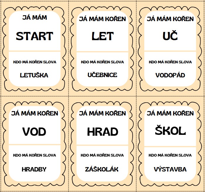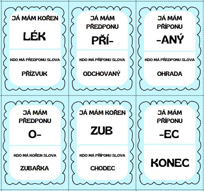 Karty se rozdají mezi hráče, začíná ten, kdo má kartičku START a přečte dolní polovinu karty. Hráči mezi svými kartami hledají odpověď (kořen, předponu, příponu). Kdo ji má, přečte ji a následně i dolní polovinu, na ni se zase hledá odpověď. Takto hra pokračuje, dokud se nedojde ke kartičce s cílem.