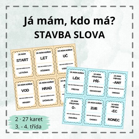 Hra typu Já mám, kdo má? souží k procvičení učiva stavba slova. Obsahuje dvě hry - v jedné žáci procvičují jen hledání kořene slova (oranžové kartičky), ve druhé již musí rozlišit kořen, předponovou a příponovou část slova (modré kartičky). Každá sada má 27 karet.