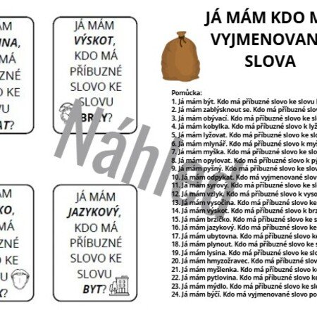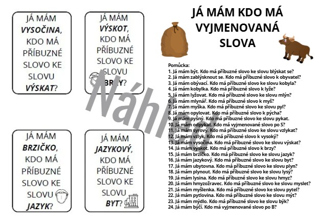 Zalaminované kartičky rozdejte dětem. Následovně děti říkají: "Já mám.., kdo má...?" a na to navazují další děti. Hra rozvíjí pozornost, soustředění a zároveň si opakují vyjmenovaná a příbuzná slova.
