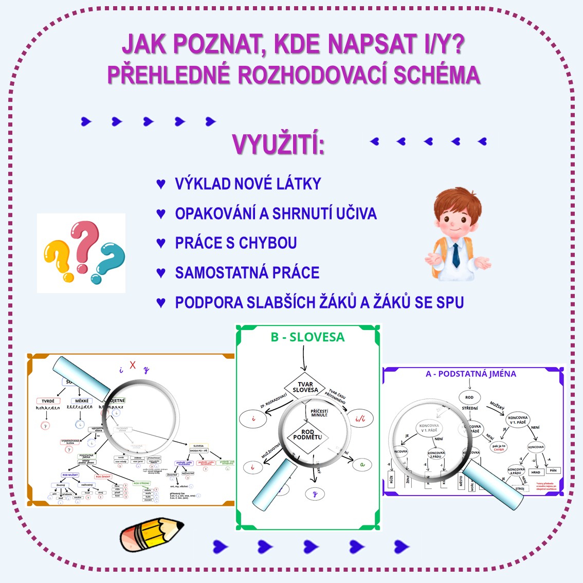 Materiál slouží jako učební pomůcka, vede žáky krok za krokem ke správnému pravopisnému rozhodnutí.