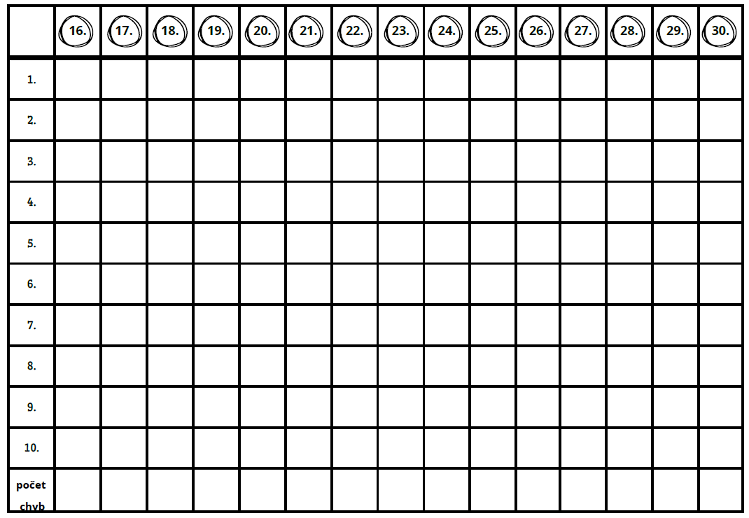 - Po vyplnění celé karty si žák dojde pro kartu s řešením. Chyby si sám opraví barevnou tužkou. Nebo využívám opravy od spolužáků.