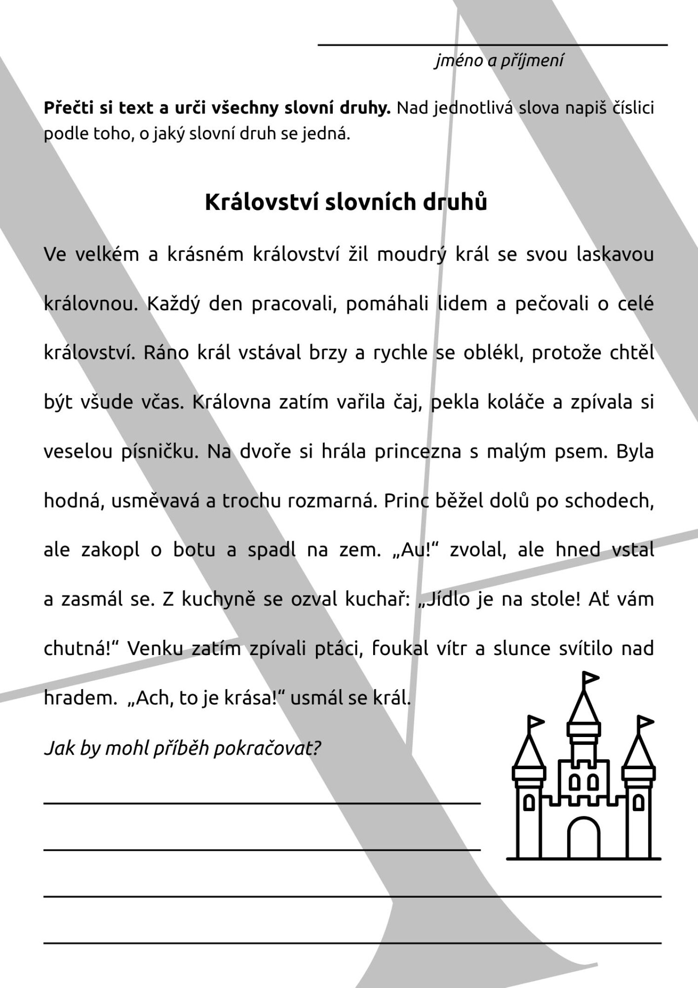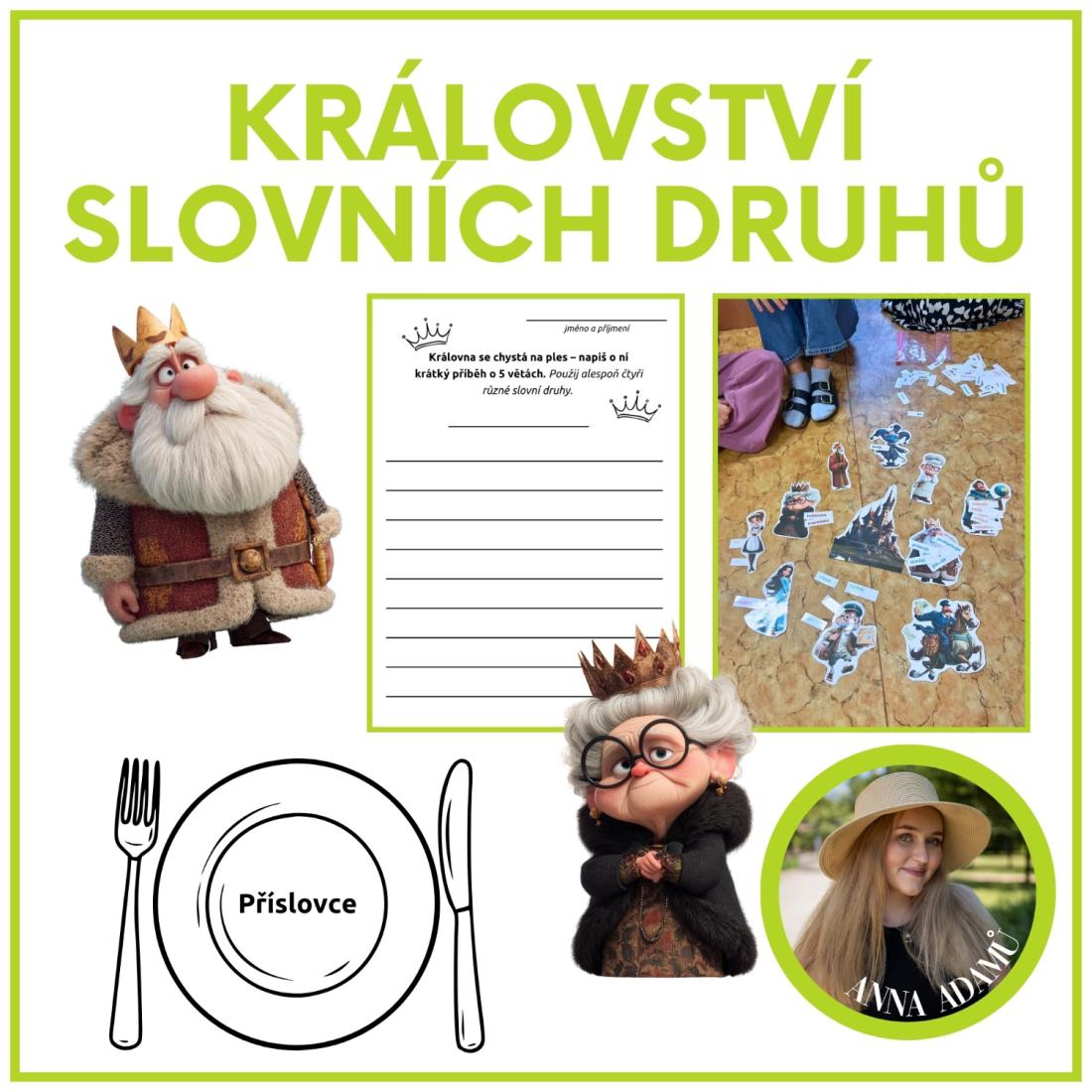 Pomůcky: Vytištěné postavy, text Království slovních druhů, pracovní listy pro jednotlivé aktivity.