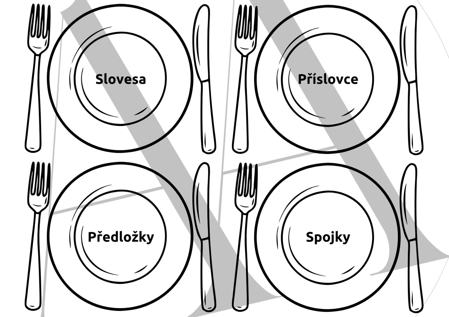 – Na každý talíř žáci třídí slova podle správného slovního druhu.