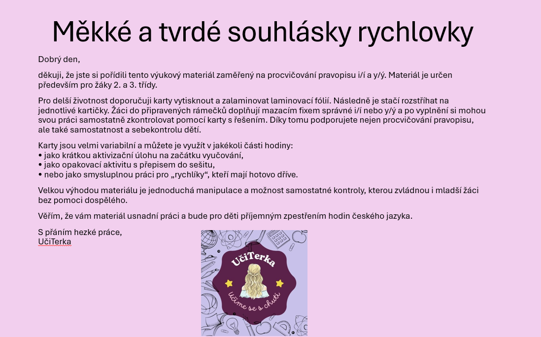 Tyto kartičky jsou výborným nástrojem k rychlému procvičení měkkých a tvrdých souhlásek. Aktivita je výborná v tom, že si děti mohou samostatně zkontrolovat. Využívám kartičky jako motivační aktivitu na začátku nebo jako práci pro rychlíky.