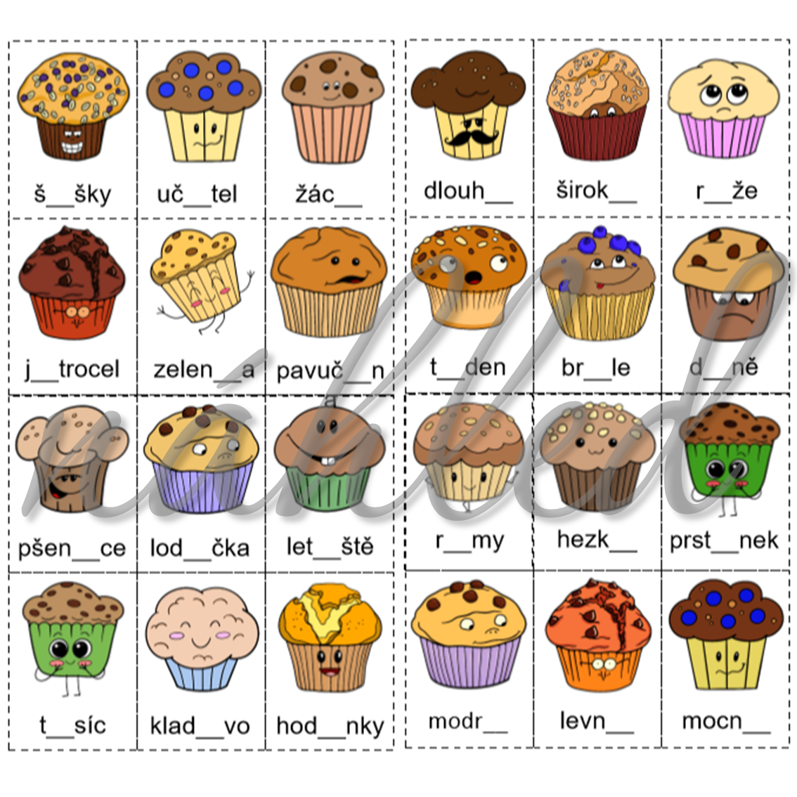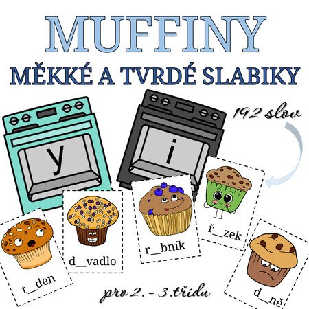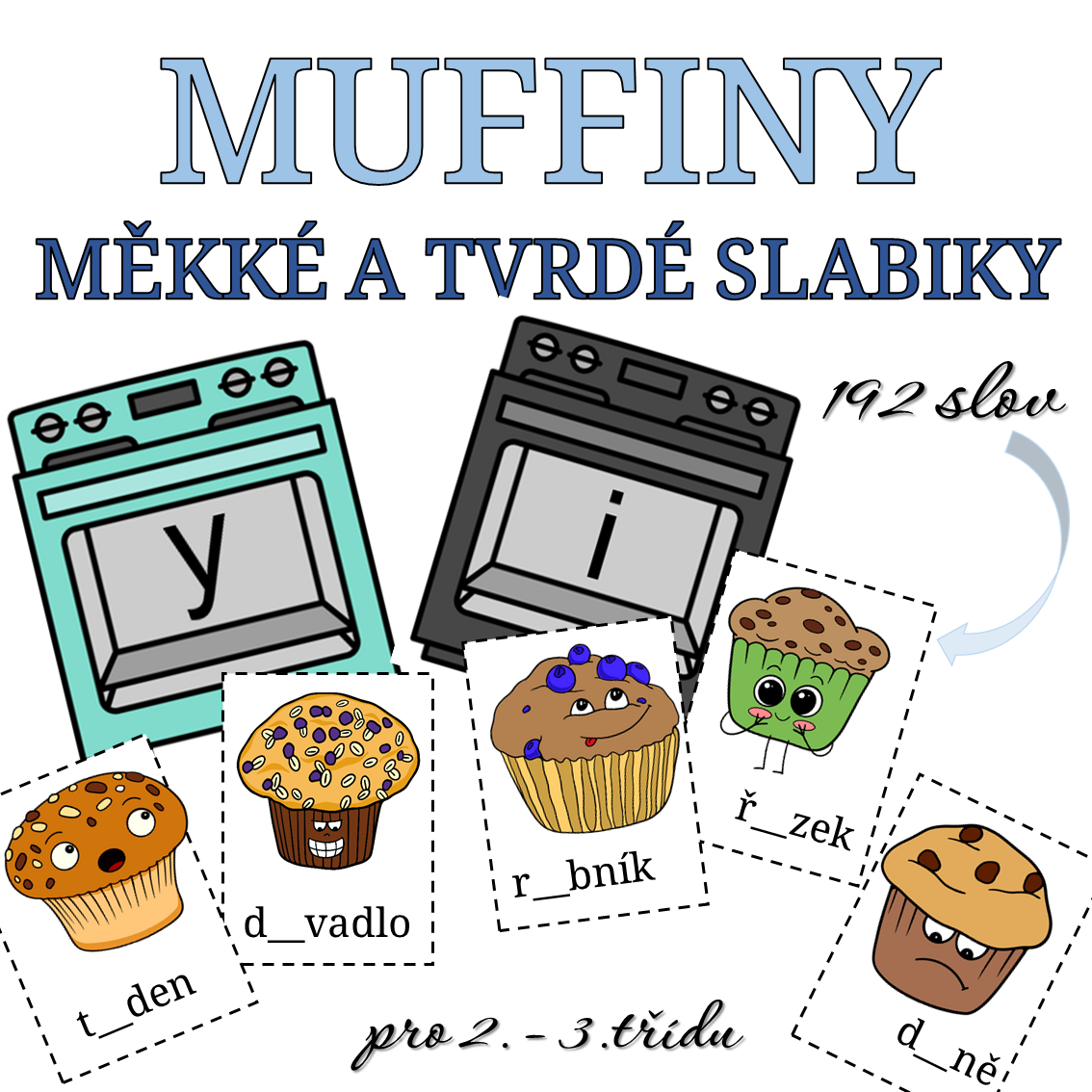 Pomůcka „Muffiny“ je navržena pro hravé procvičování pravopisu měkkých (i) a tvrdých (y) slabik. Obsahuje 192 slov ve formě muffinových kartiček, které děti přiřazují do „troub“ podle správné slabiky.