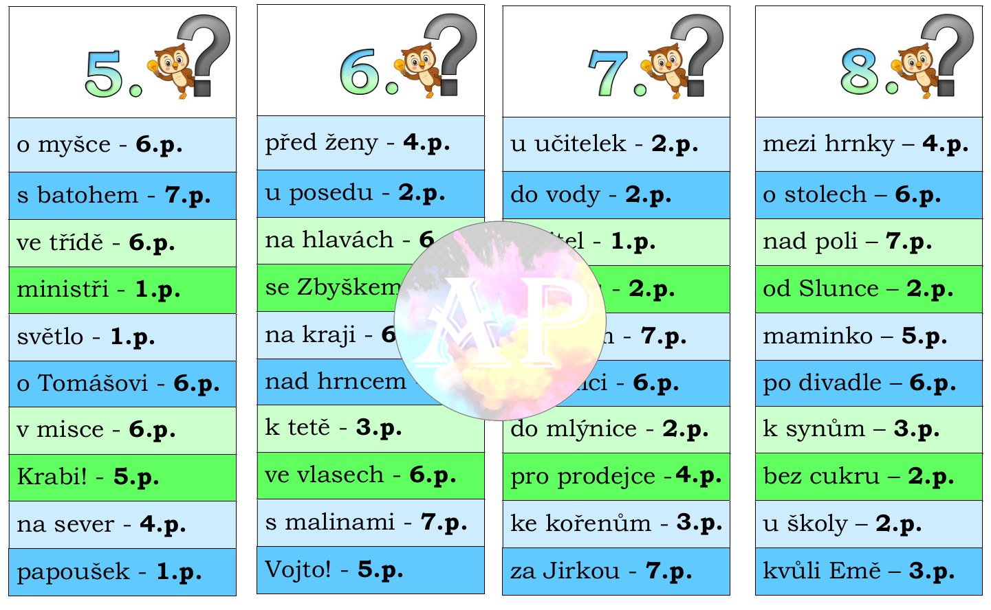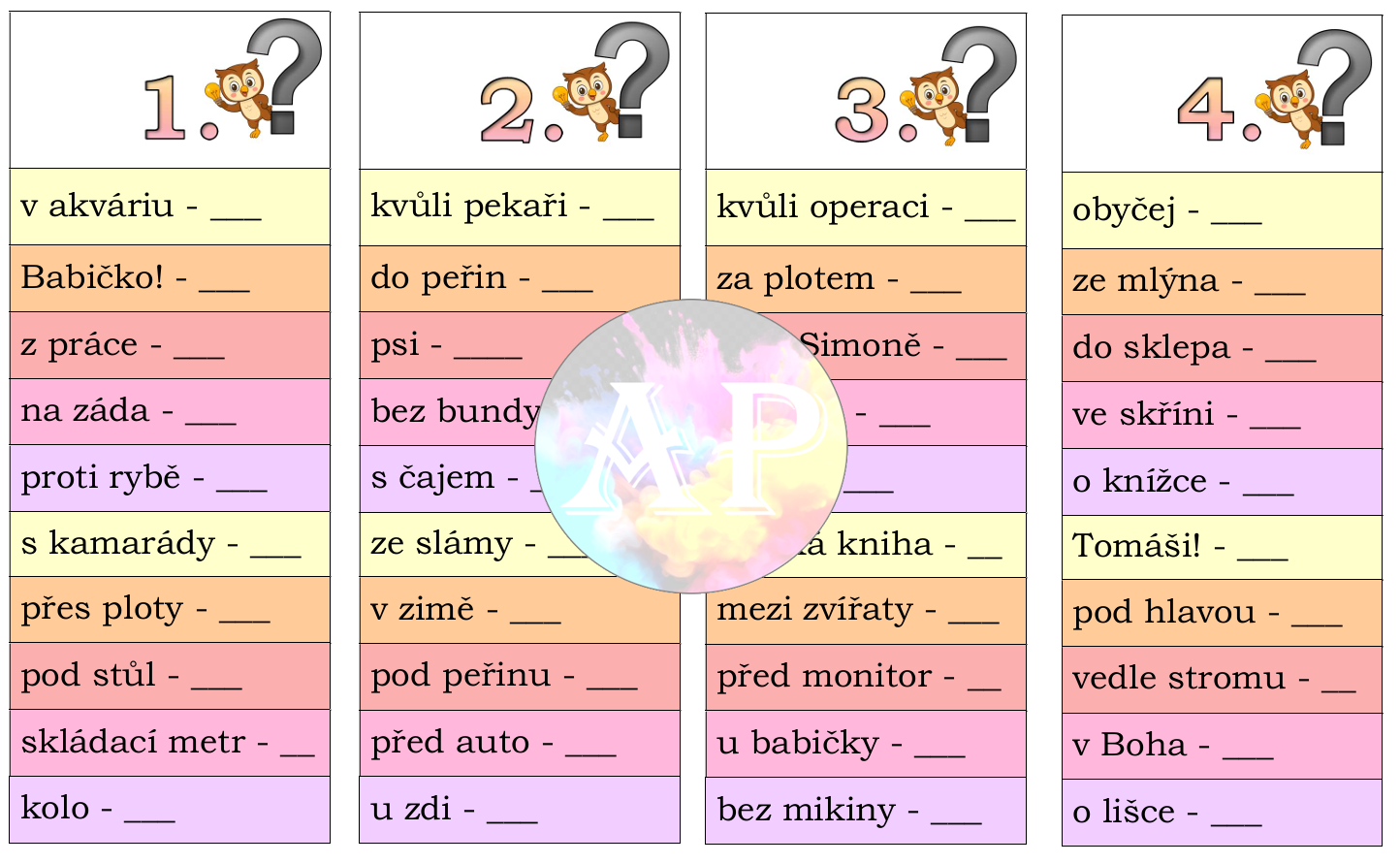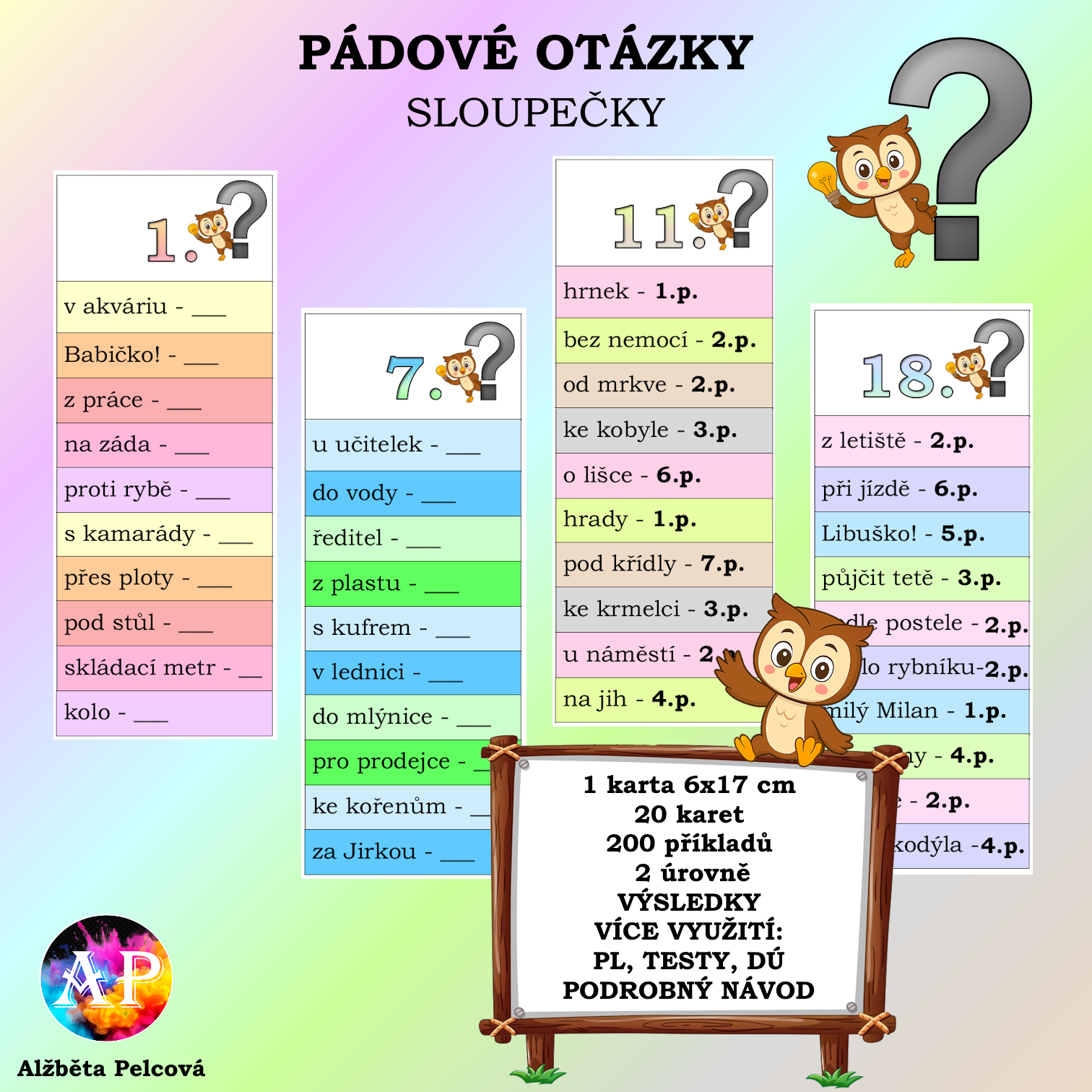 Sloupečky obsahují slovní příklady na procvičování pádových otázek.