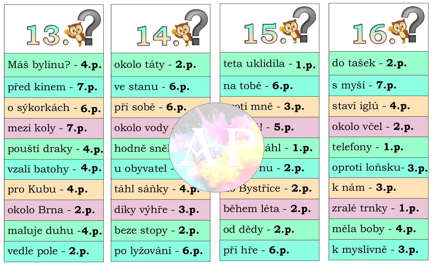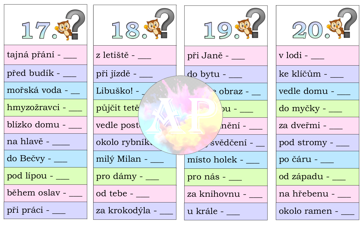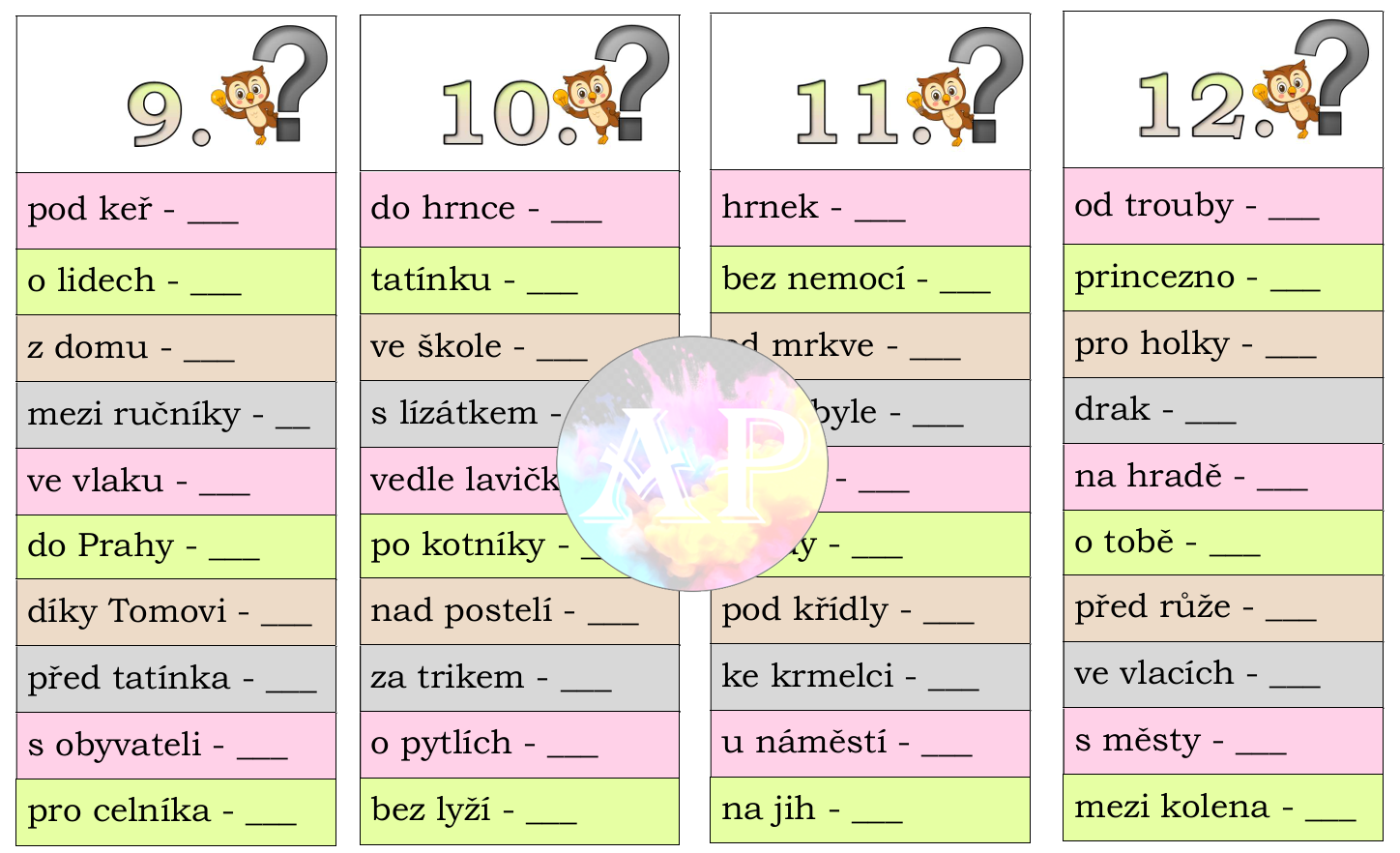 Sloupečky obsahují slovní příklady na procvičování pádových otázek.