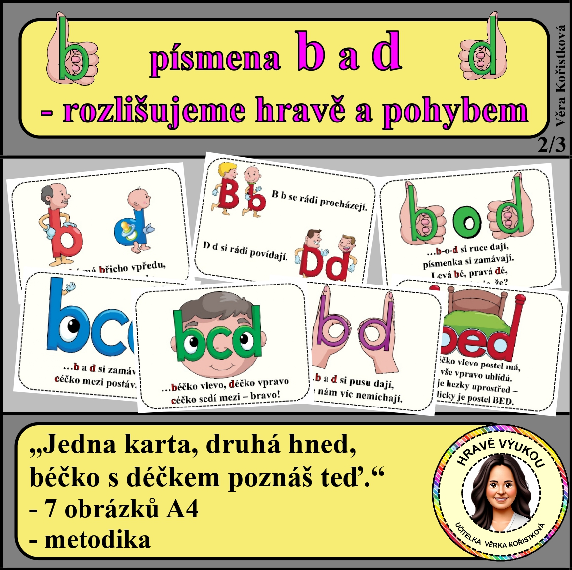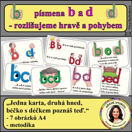 Materiál je zaměřen na systematické a dlouhodobé upevnění rozlišování písmen b a d u žáků 1. a 2. ročníku. Vychází z principu propojení více smyslů – zrakového vnímání, pohybu, prostorové orientace i rytmu. Díky tomu si děti vytvářejí pevnou paměťovou stopu a minimalizují zrcadlové zaměňování písmen při čtení i psaní.