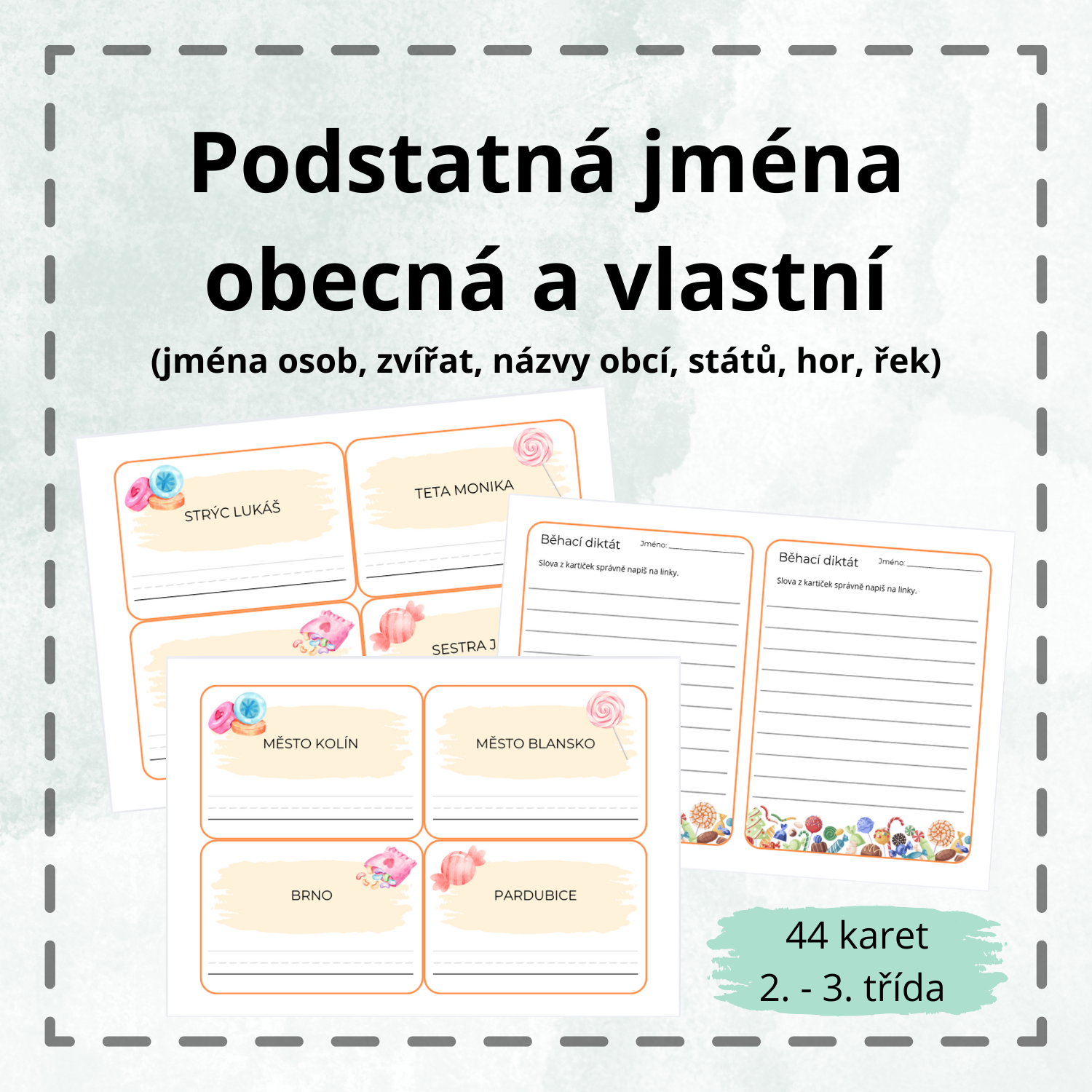 Materiál obsahuje celkem 44 kartiček k procvičení psaní velkých a malých písmen podstatných jmen (obecná a vlastní).