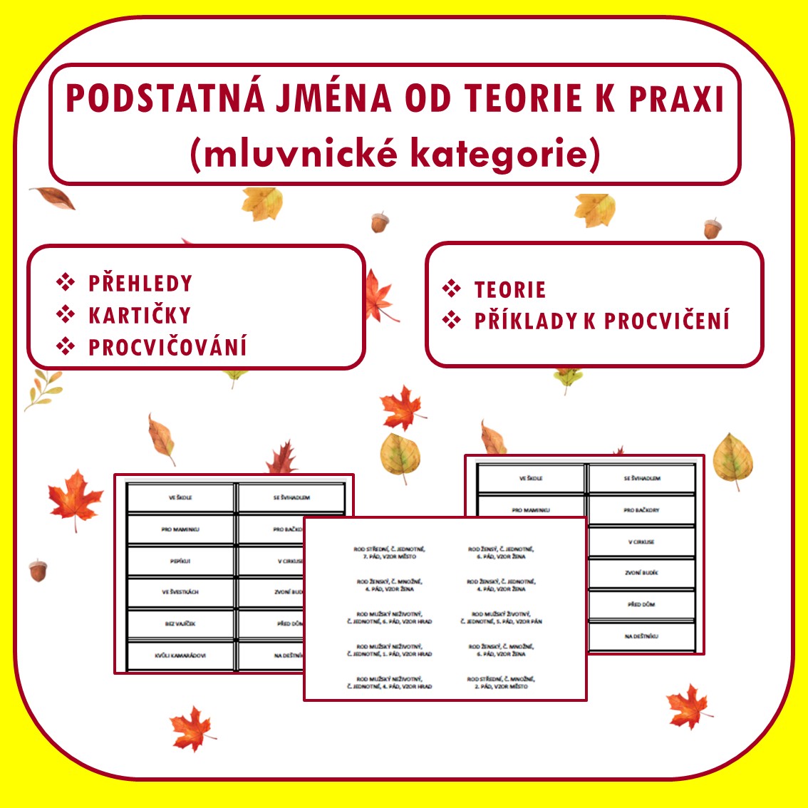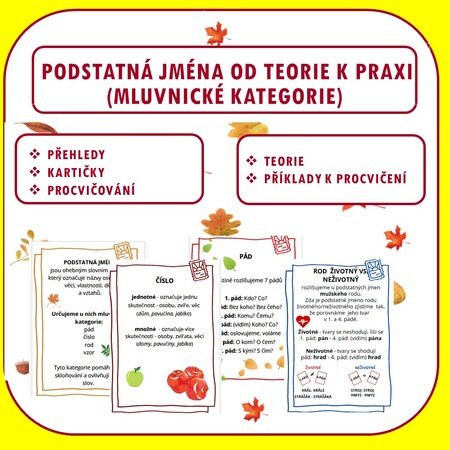 Materiál obsahuje teoretické karty s přehledným výkladem mluvnických kategorií podstatných jmen a procvičovací kartičky, na nichž si žáci upevňují znalosti určováním těchto kategorií.