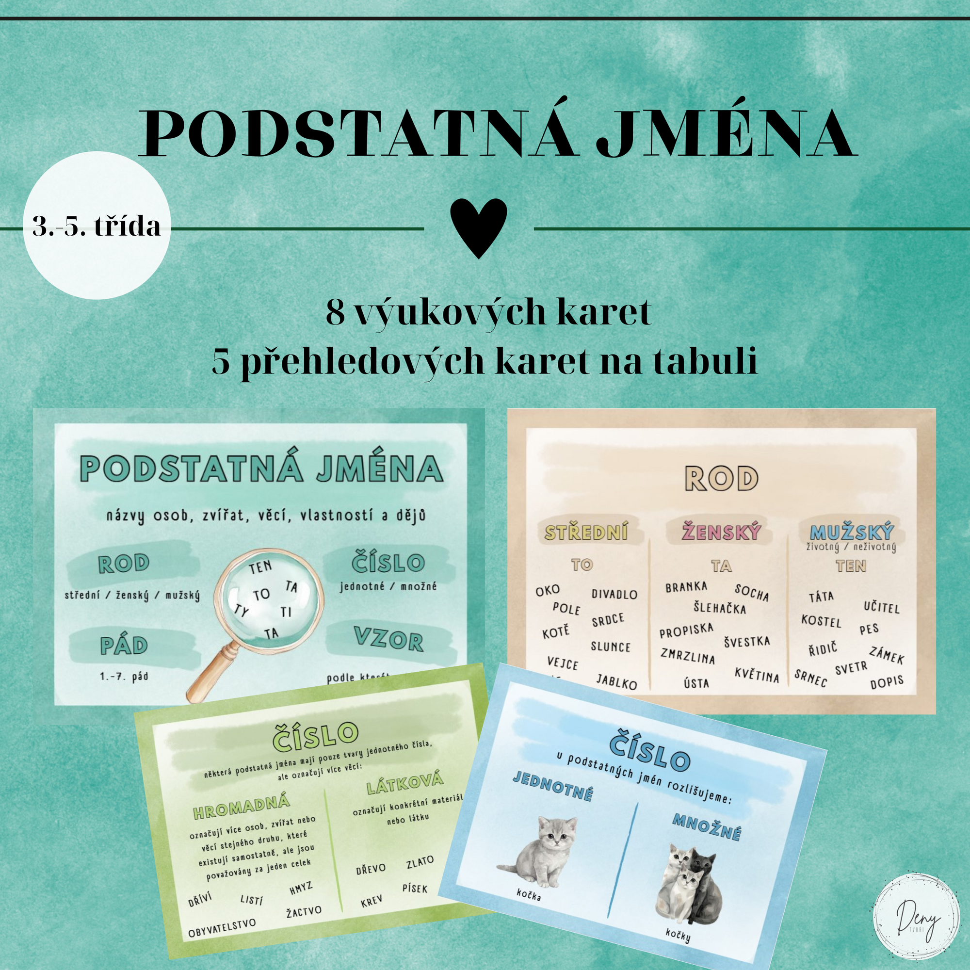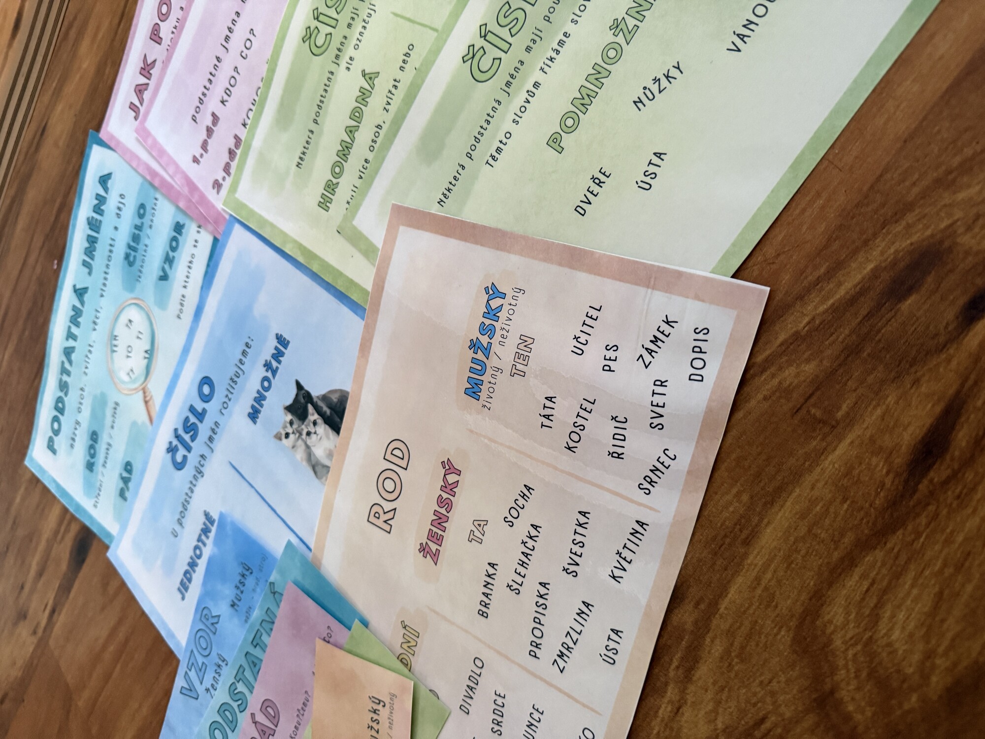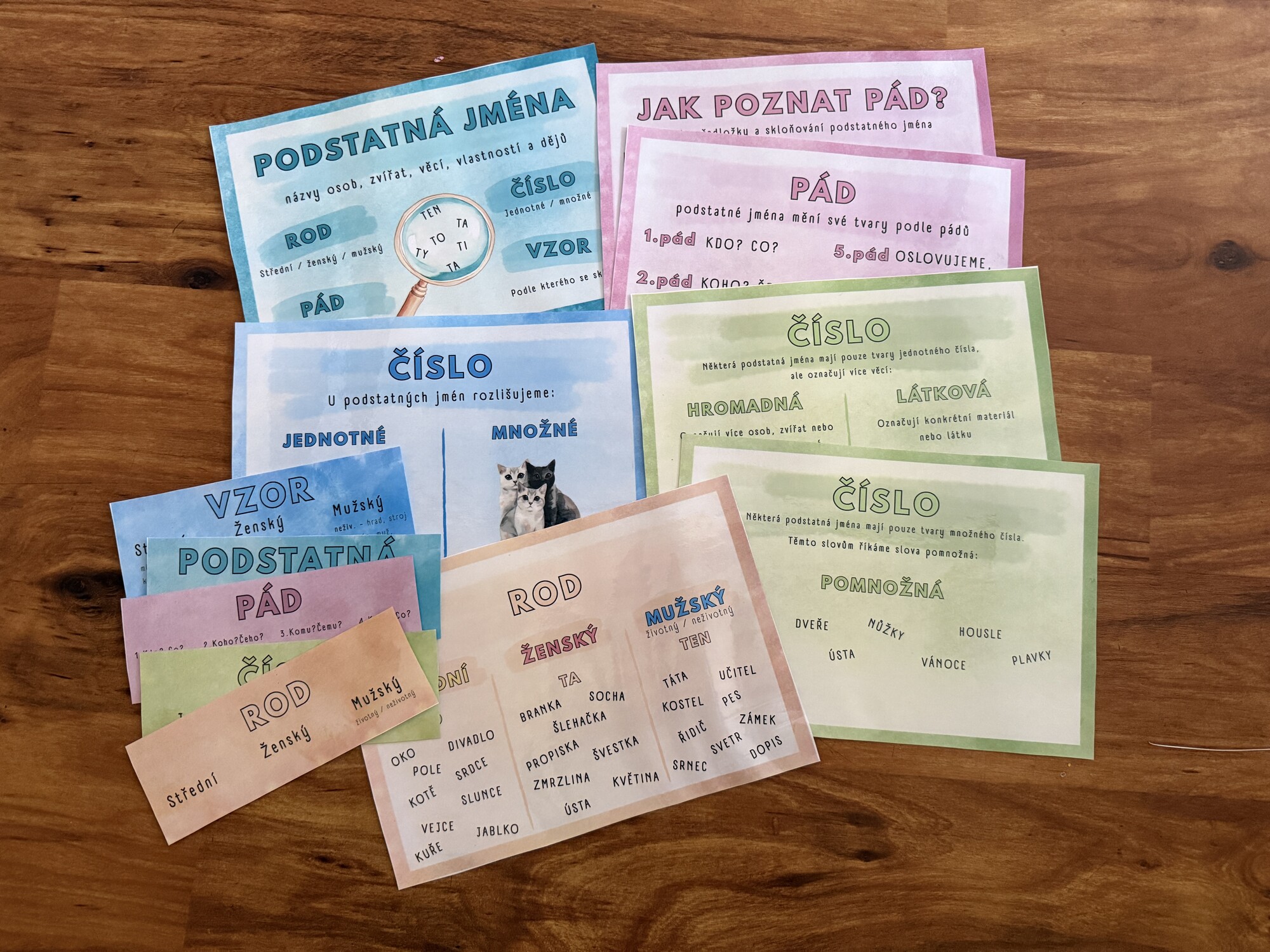 - 8 výukových karet: Podstatná jména, pády, číslo (jednotné, množné, hromadné, látkové, pomnožné), rod, vzory podstatných jmen