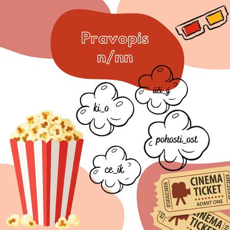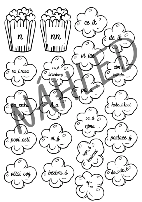 Materiál slouží k třídění popcornů do krabičky podle toho, kde se píše n nebo nn. Lze využít do dvojic na procvičení.
