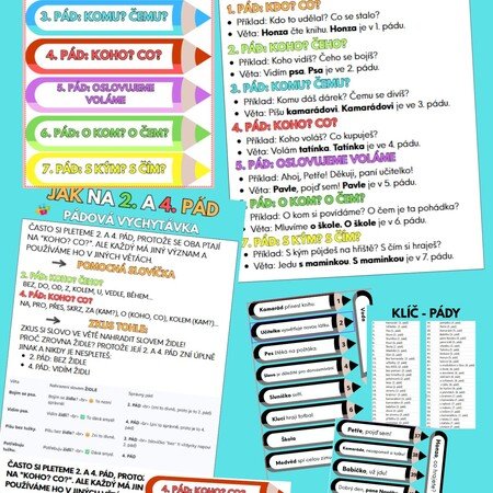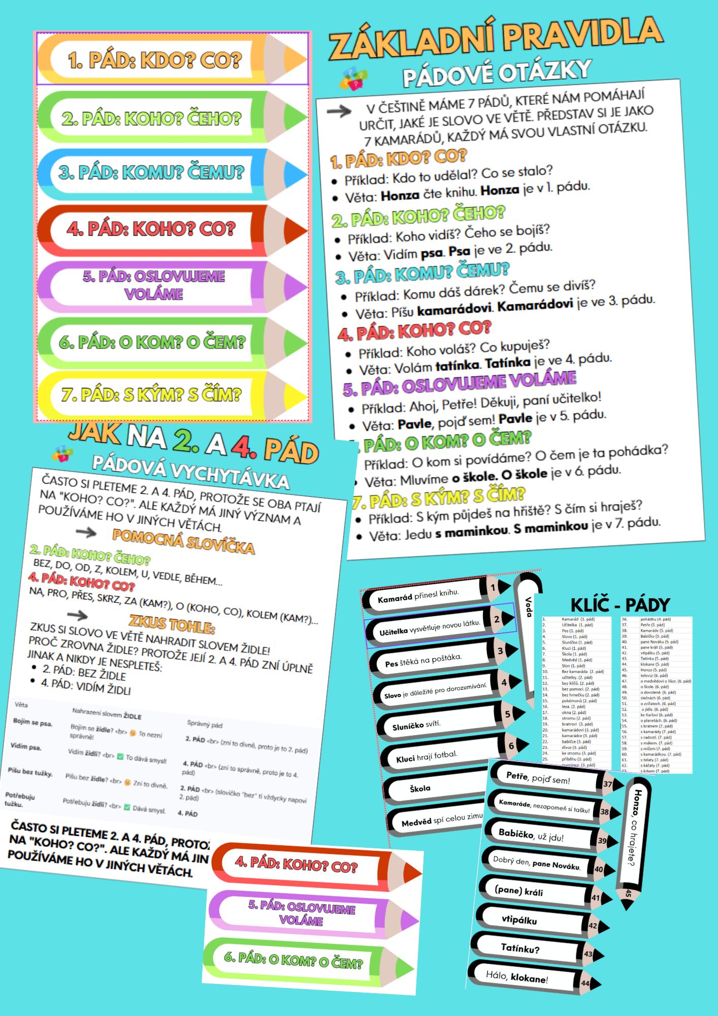 - přehledné plakáty s pádovými otázkami a pravidly,