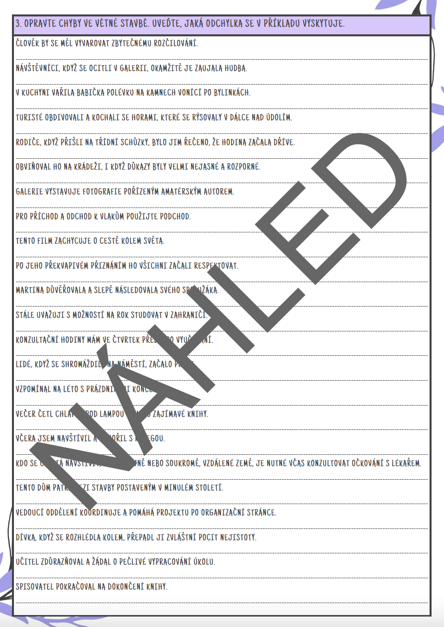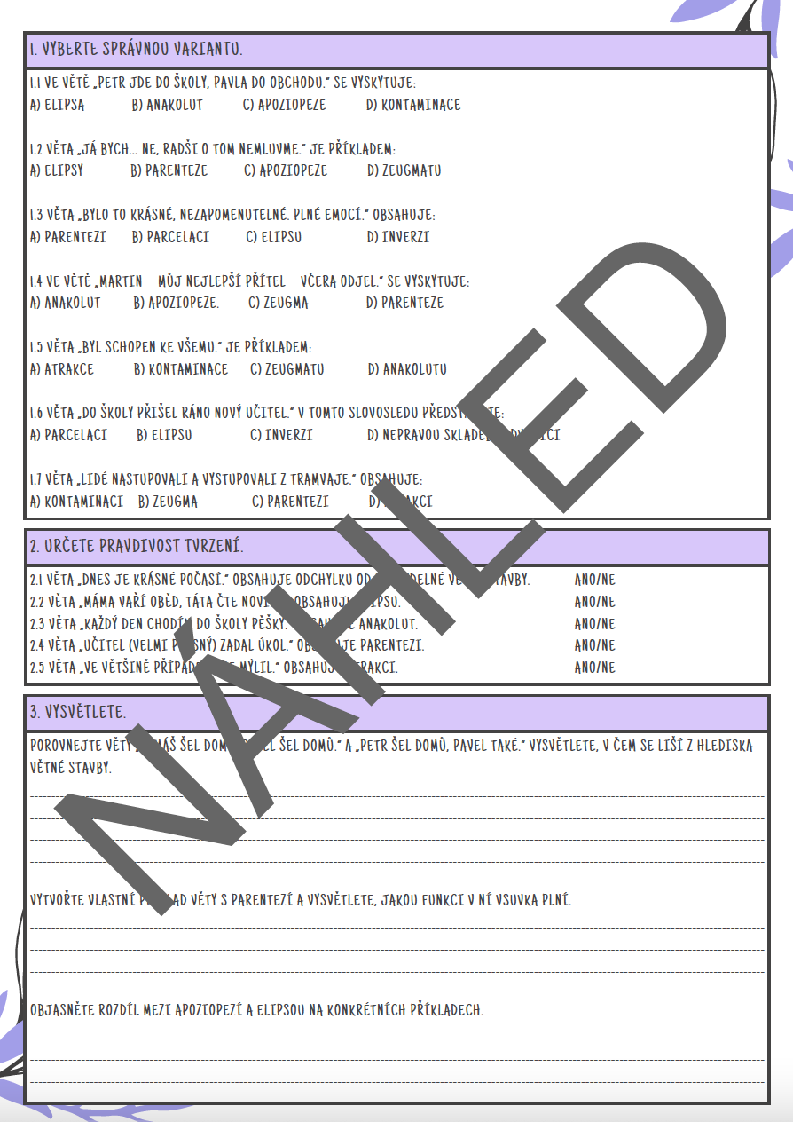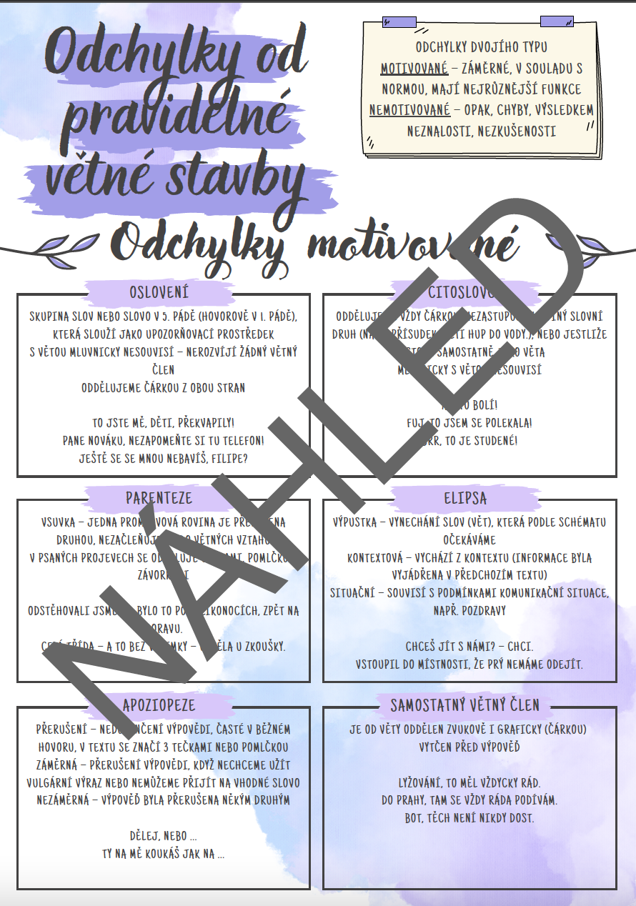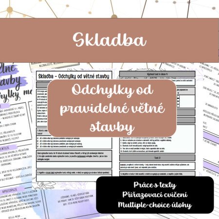 Materiál obsahuje dvě strany přehledu motivovaných a nemotivovaných odchylek od pravidelné větné stavby (definice + příklady), které mohou žáci využít jako zápisky k danému tématu. Součástí jsou "klasická" cvičení, v nichž žáci ve větách identifikují použitou odchylku, vytvářejí vlastní příklady a opravují chyby ve větné stavbě, a pracovní listy ve stylu didaktického testu. Je určeno pro žáky 3. ročníku SŠ a zároveň i jako příprava k maturitě.