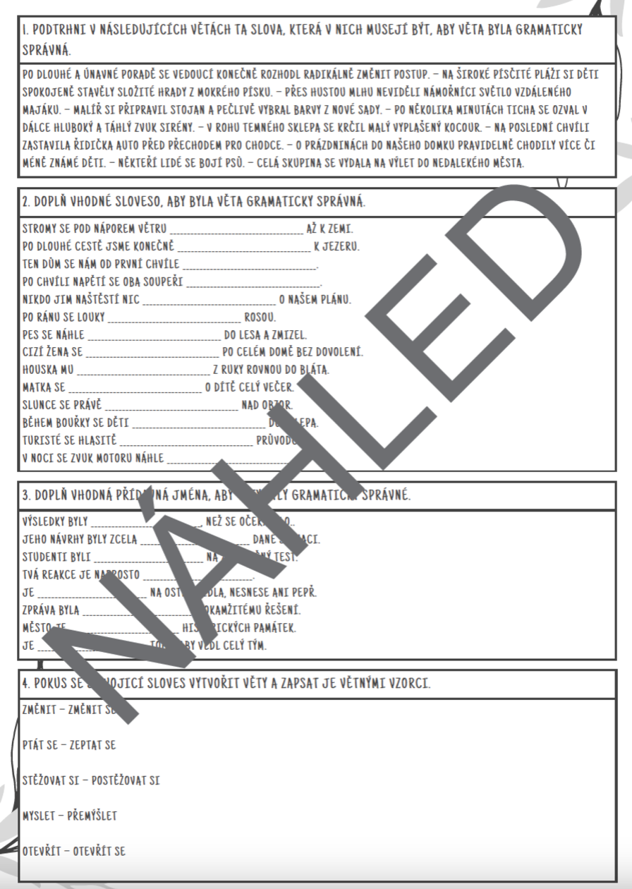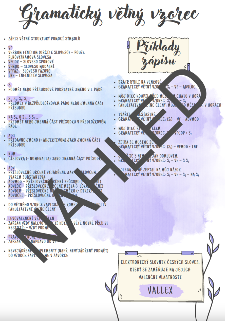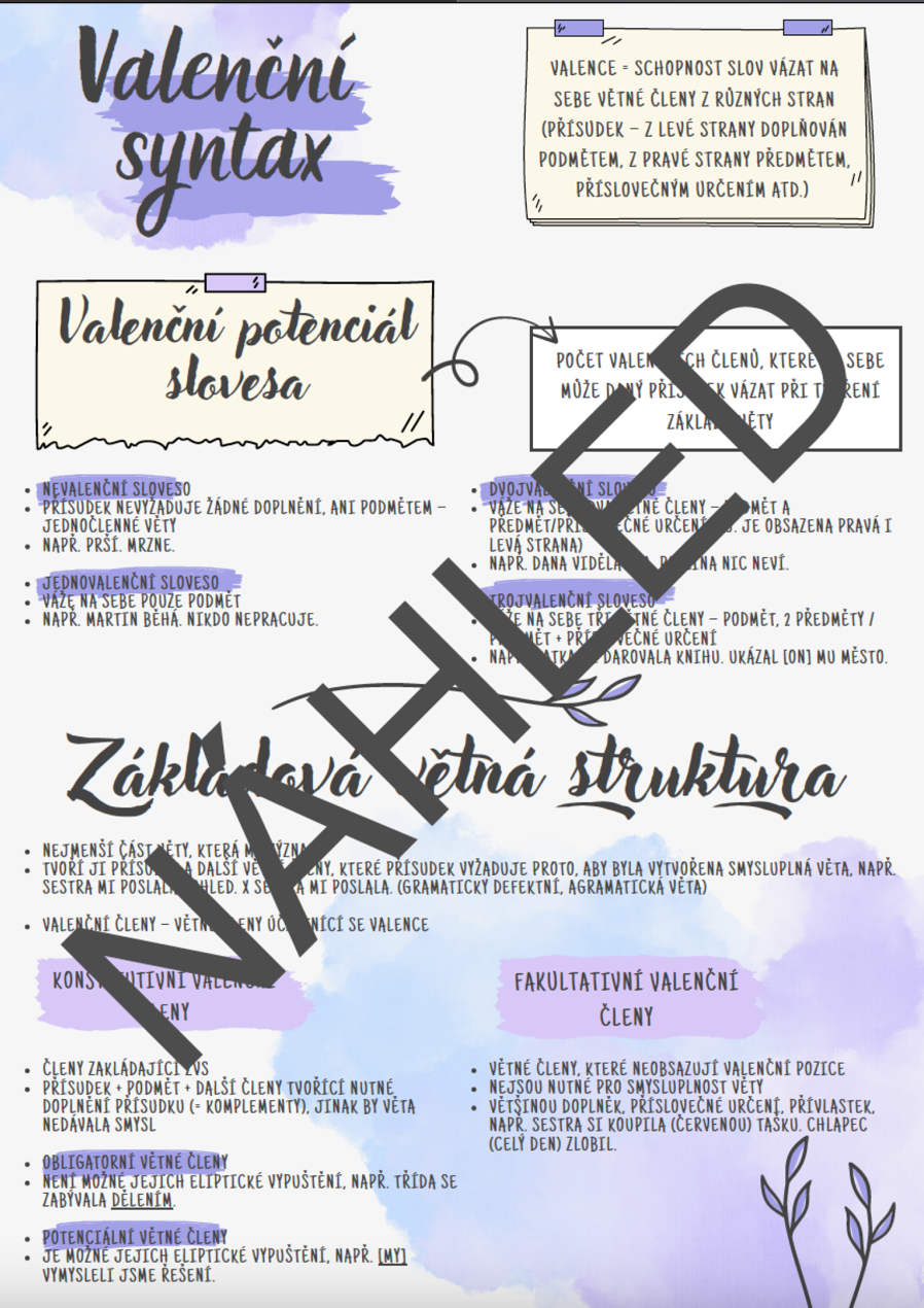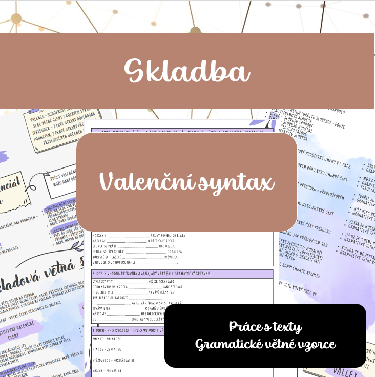 Materiál obsahuje dvě strany přehledu valenční syntaxe (definice + příklady valenčních členů), které mohou žáci využít jako zápisky k danému tématu. Součástí jsou "klasická" cvičení, v nichž žáci ve větách vyhledávají jednotlivé valenční členy, doplňují valenční členy do vět a tvoří gramatické větné vzorce. Je určeno pro žáky 3. ročníku SŠ.