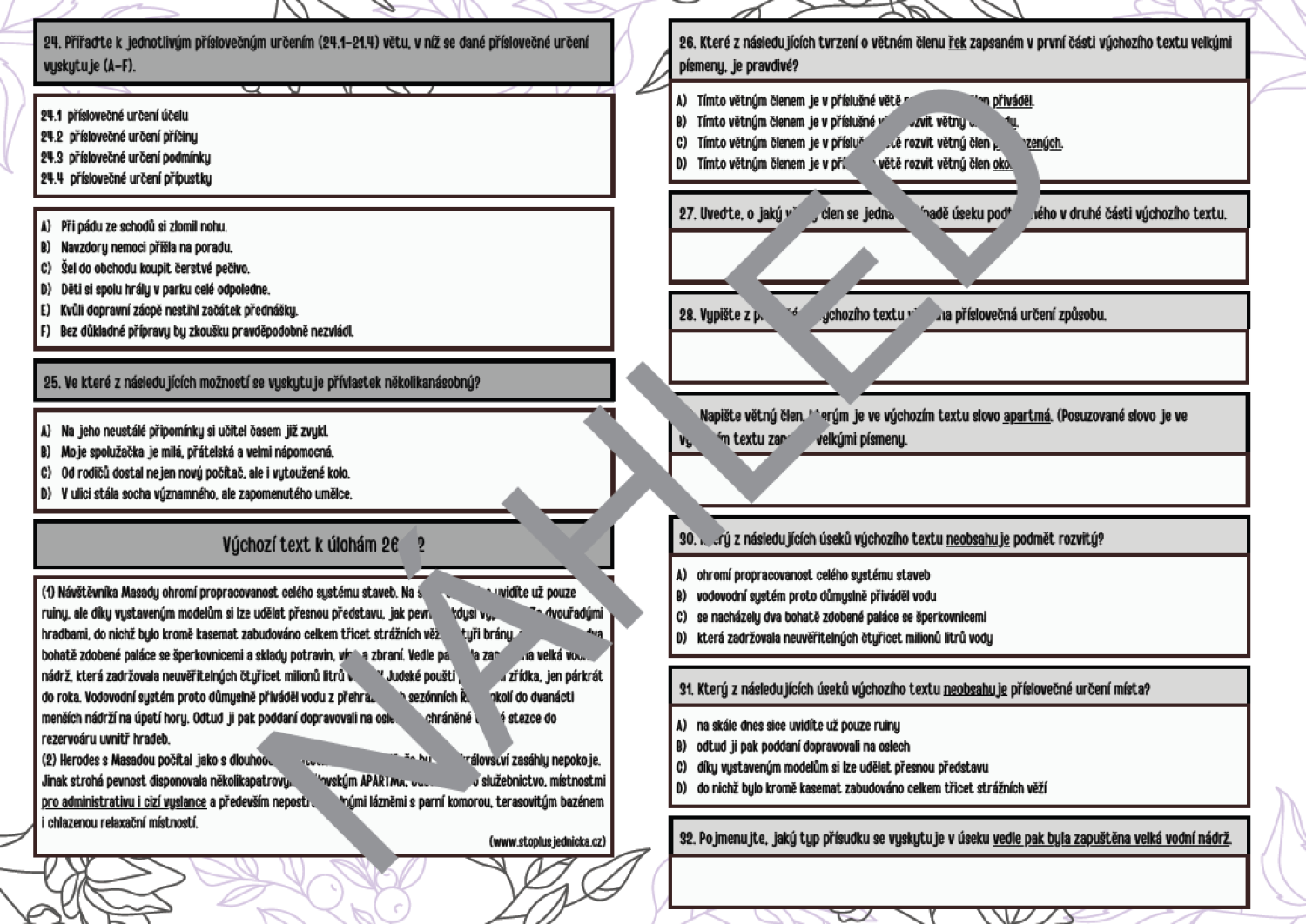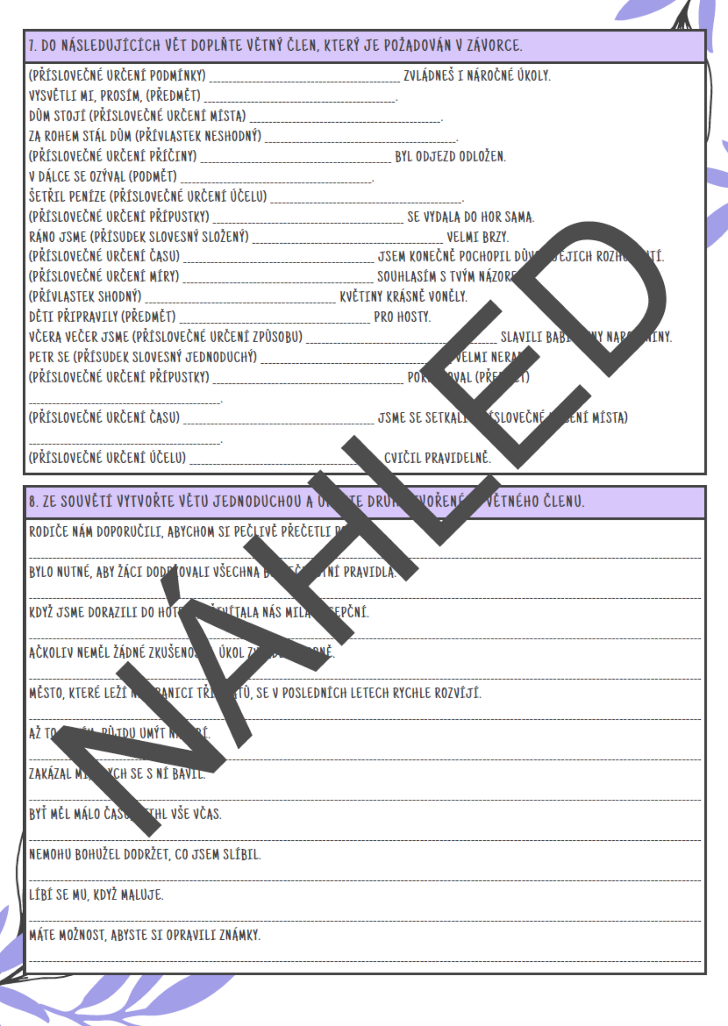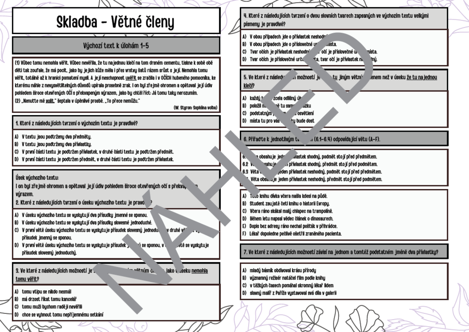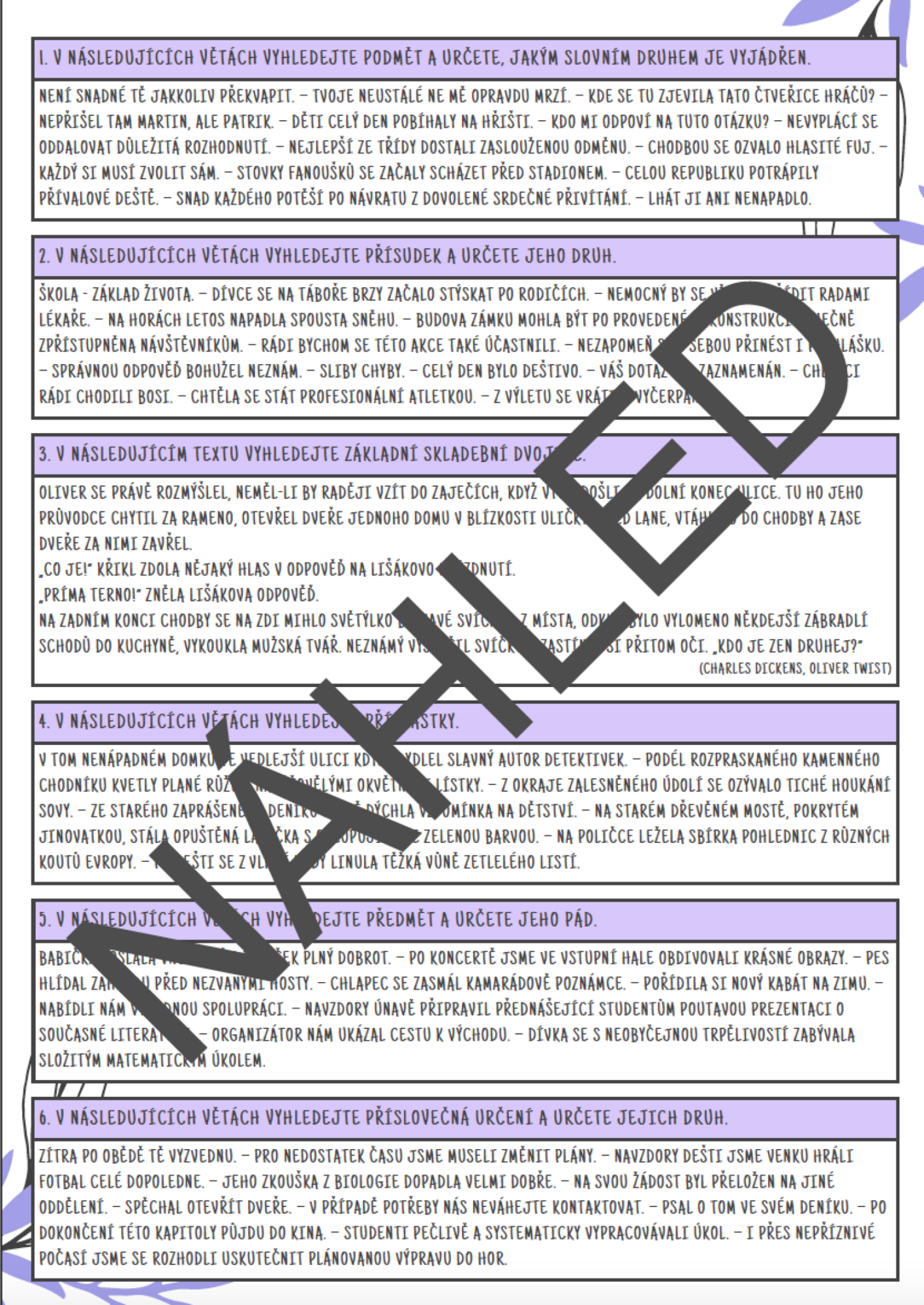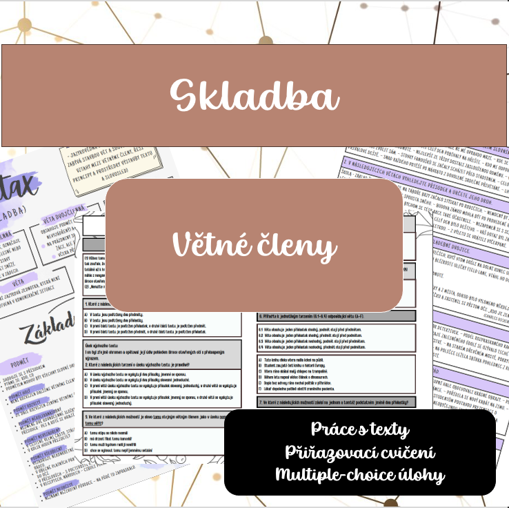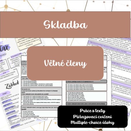 Materiál obsahuje dvě strany přehledu větných členů (definice + příklady), které mohou žáci využít jako zápisky k danému tématu. Součástí jsou "klasická" cvičení, v nichž žáci ve větách vyhledávají jednotlivé větné členy, doplňují větné členy do vět a přetvářejí souvětí na věty jednoduché, a pracovní listy ve stylu didaktického testu. Je určeno pro žáky 3. ročníku SŠ a zároveň i jako příprava k maturitě.