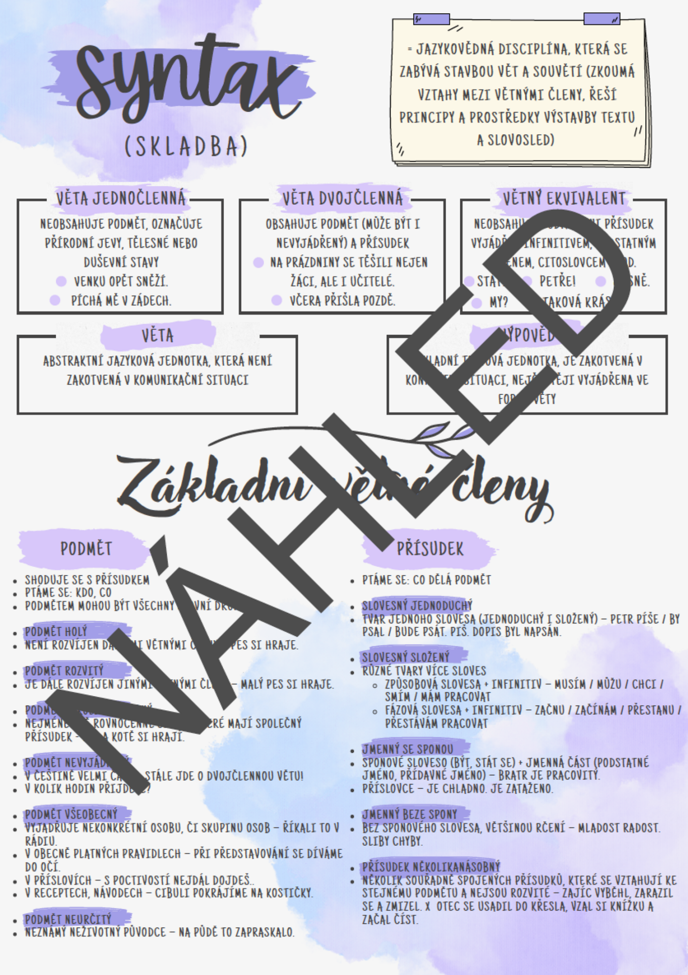 Materiál obsahuje dvě strany přehledu druhů vedlejších vět (definice + příklady), které mohou žáci využít jako zápisky k