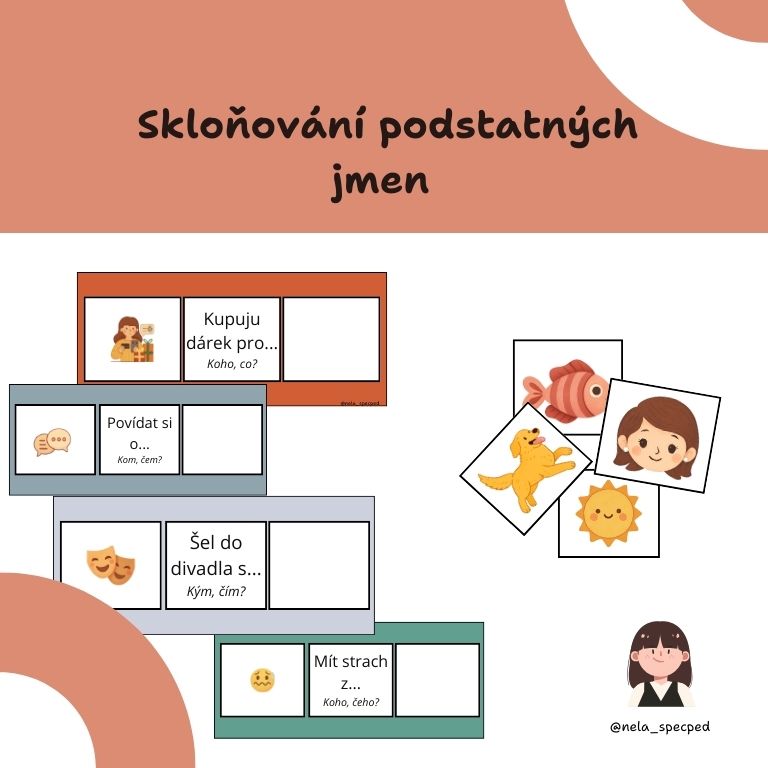 Tento materiál je určen k praktickému nácviku skloňování podstatných jmen ve větách. Dítě pracuje s krátkými větami a obrázky, aktivně doplňuje správný tvar slova podle významu věty. Základním principem je učení skrze jazykovou vazbu (např. běží ke komu, hraje si s kým, mluví o kom). Dítě si postupně ukládá správné tvary díky opakování v přirozeném kontextu. Pádové otázky zde slouží pouze jako podpůrný nástroj.