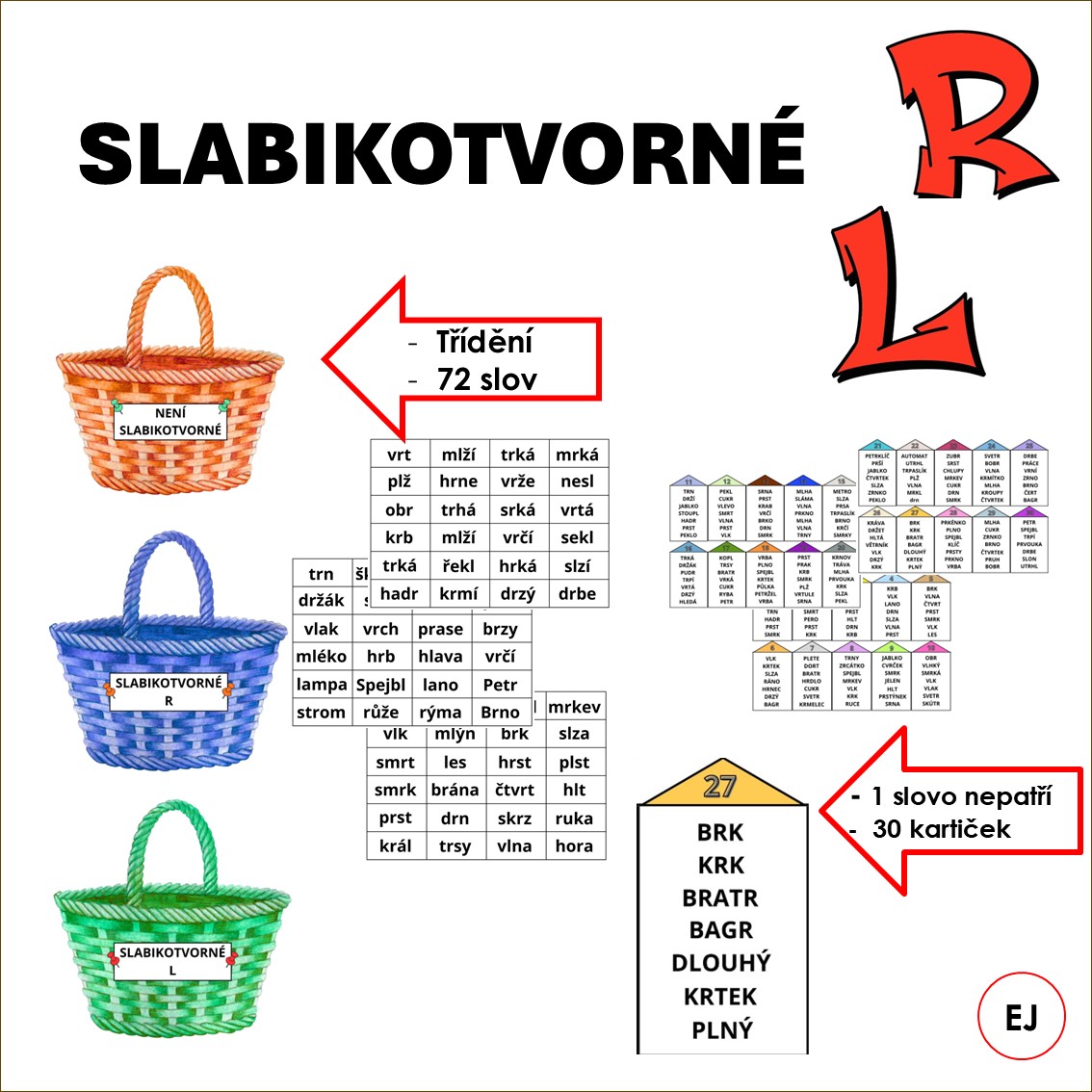- třídění 72 slov do košíků - slabikotvorné R, slabikotvorné L, není slabikotvorné