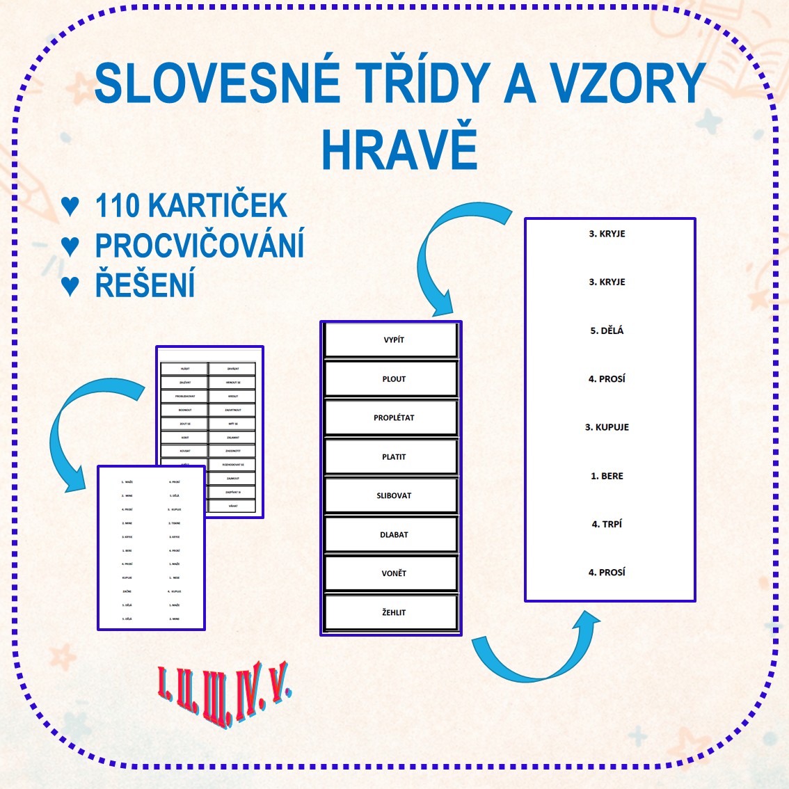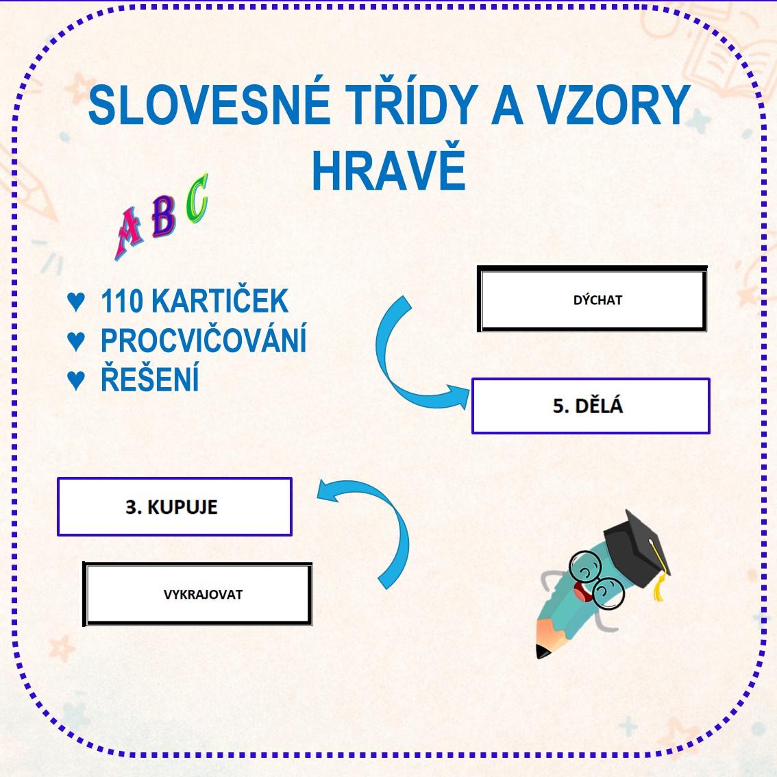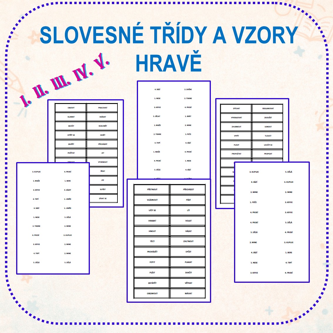 Materiál je přehledná a praktická pomůcka určená k procvičování slovesných tříd a vzorů u žáků 8. a 9. ročníku ZŠ.