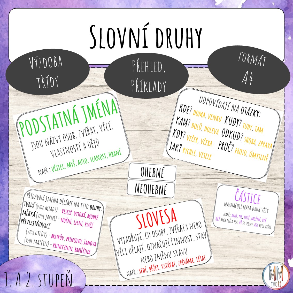 V souboru naleznete názvy jednotlivých slovních druhů spolu s jejich čísly k vyvěšení ve třídě, dále charakteristiky jednotlivých slovních druhů spolu s příklady a jejich případným dělením. Materiál slouží především jako názorná pomůcka a výzdoba třídy, lze vytisknout i malé verze a nalepit je dětem na lavici nebo do speciálního sešitu. Pro použití na 1. stupni je nutné vytisknout pouze některé stránky dle přiměřenosti věku dětí.