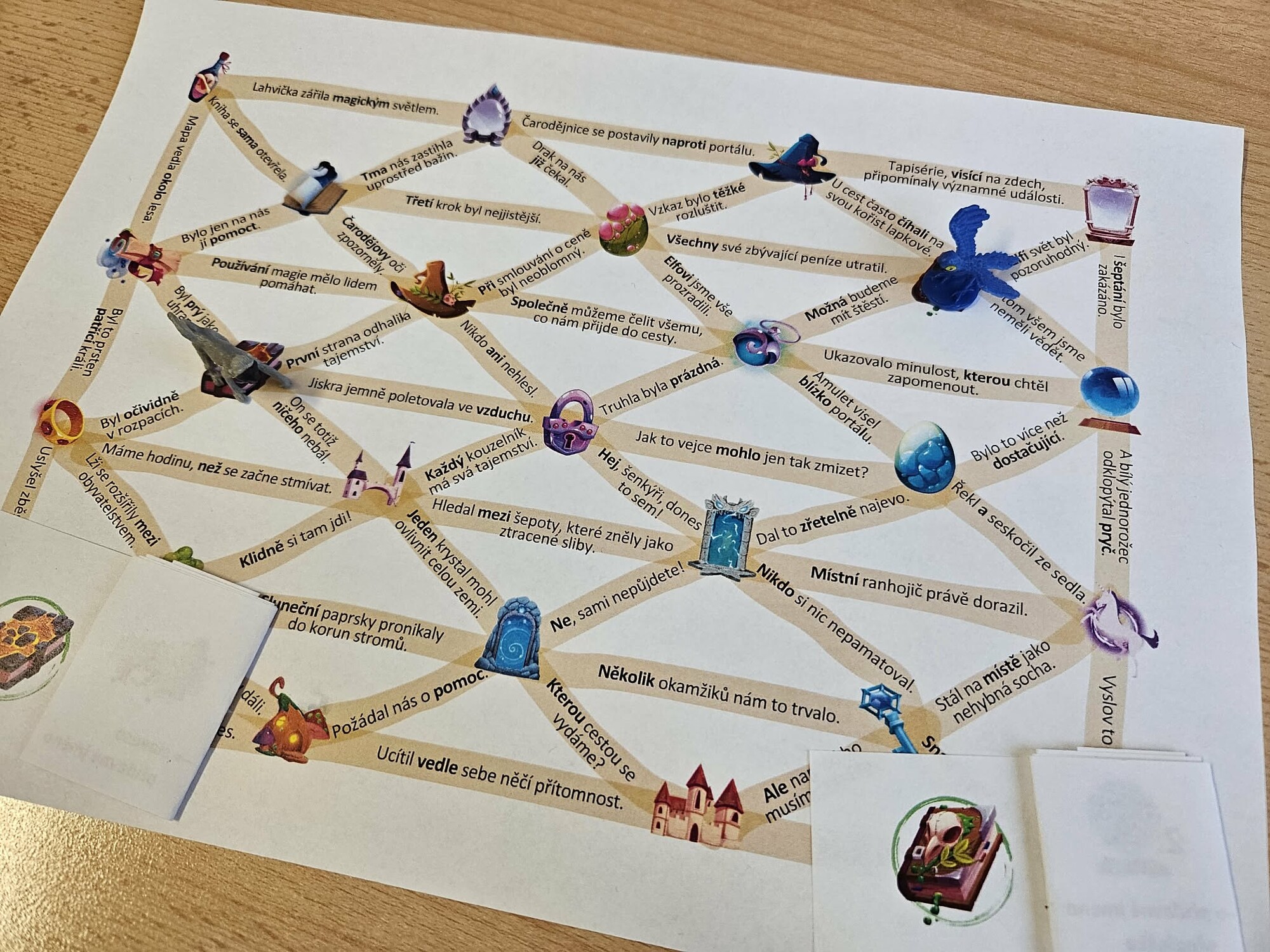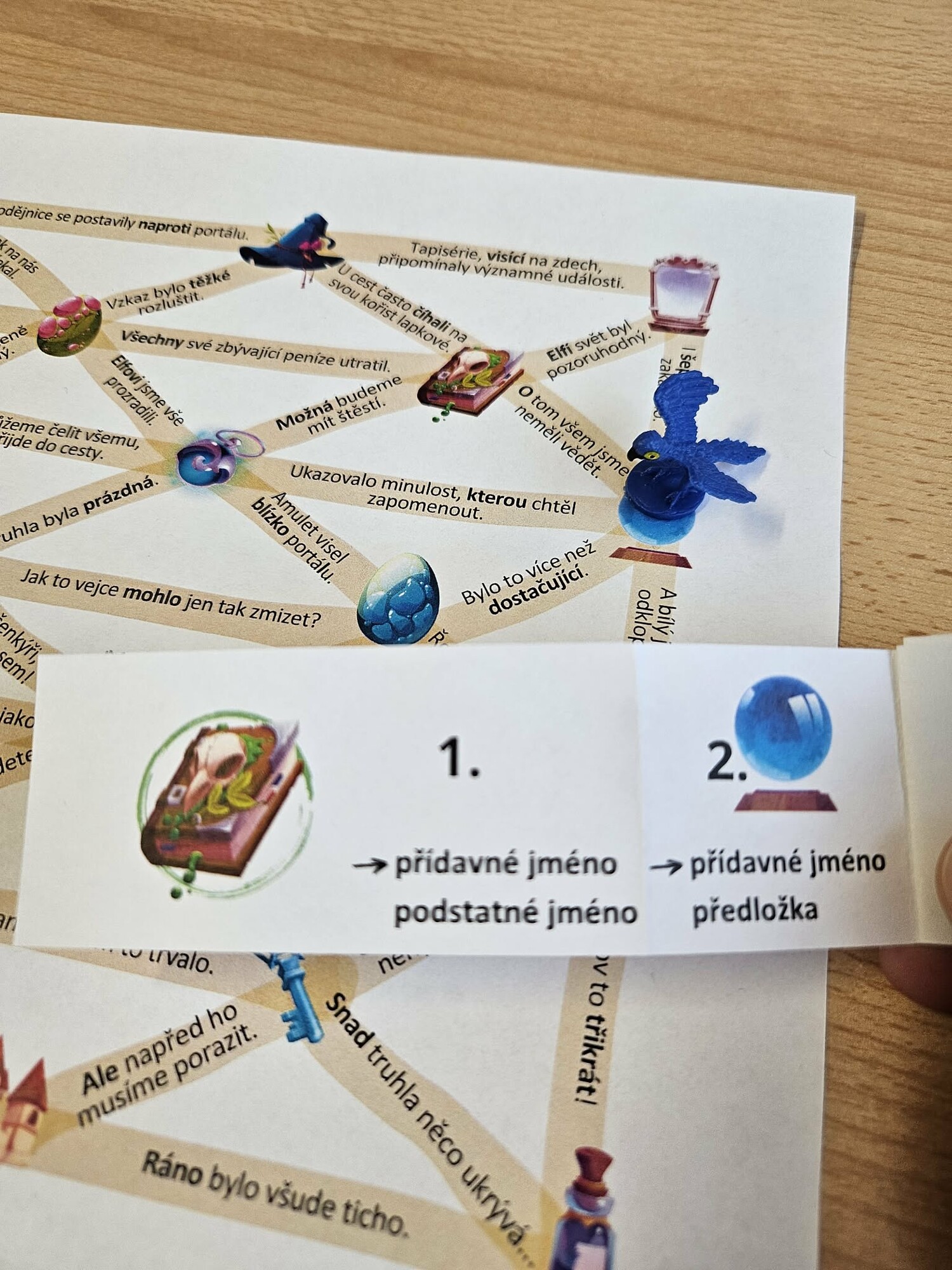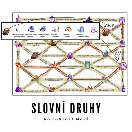 Tento výukový materiál slouží k procvičení slovních druhů formou fantasy hry. Žáci se pohybují po mapě a postupují po jednotlivých cestách na základě instrukcí (např. najdi přídavné jméno → pak pokračuj přes podstatné jméno). Obsahuje 6 cest. Materiál je vhodný pro SŠ i 2. stupeň ZŠ.