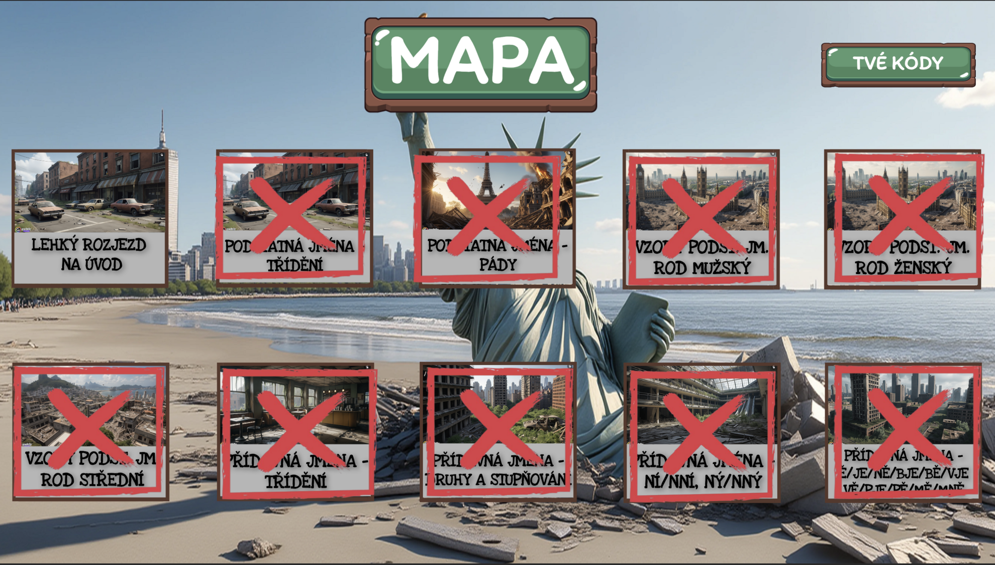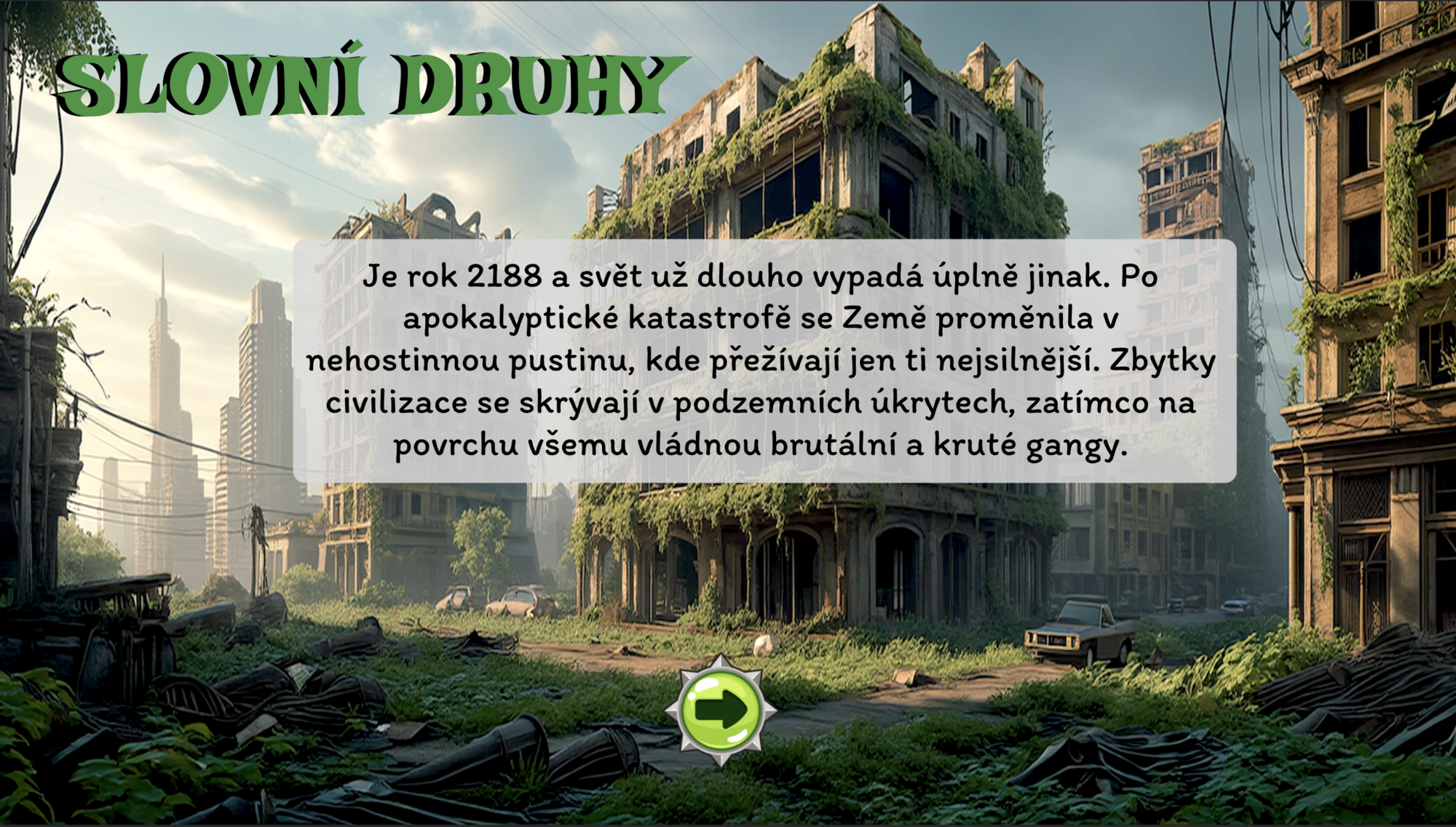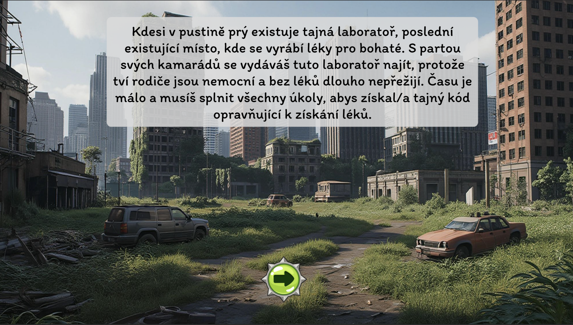 Děkuji, že jste se rozhodli pro nákup tohoto interaktivního materiálu. Jedná se o obsáhlou online interaktivní hru na podstatná a přídavná jména. Obsahuje 14 různých cvičení. Žák postupně sbírá 10 kódů, které na závěr zadává do zámku. Tematicky se hra odehrává v daleké budoucnosti, kdy je svět po apokalyptické katastrofě. Úkolem je získat všech 10 kódů sloužících pro získání vzácných léků. Ty jsou nedostupné a skryté v jisté tajné super laboratoři kdesi v americké pustině.