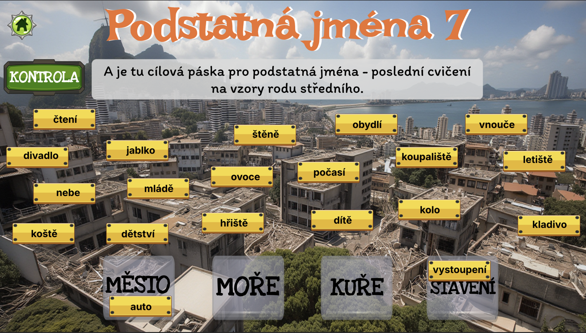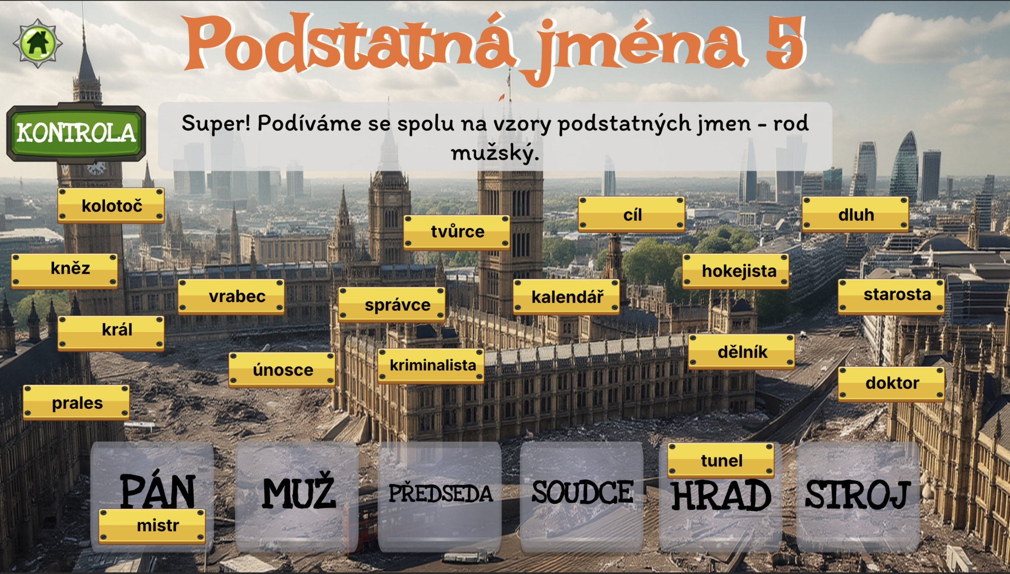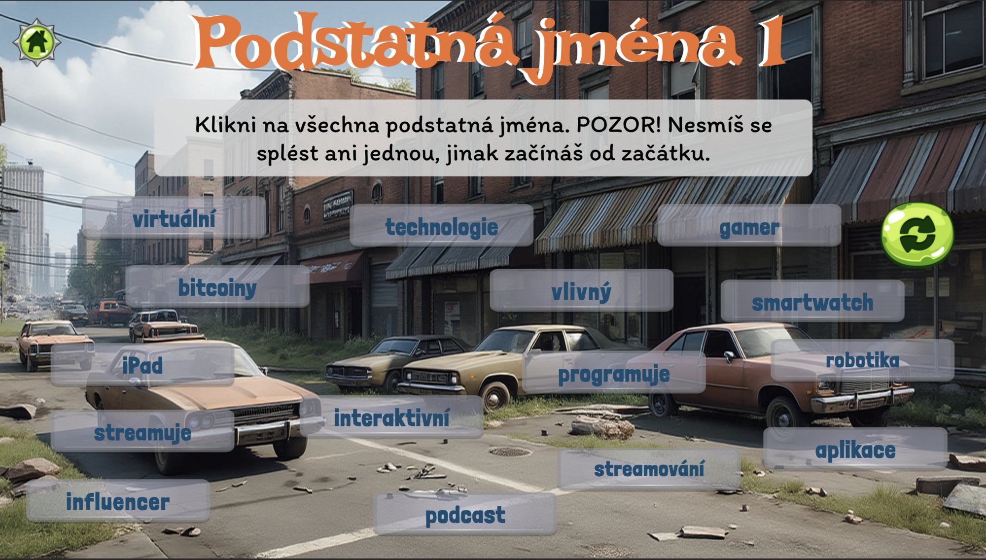 15 + 15 slov, žák vybírá a kliká na všechna podstatná jména. Pokud udělá chybu, objeví se