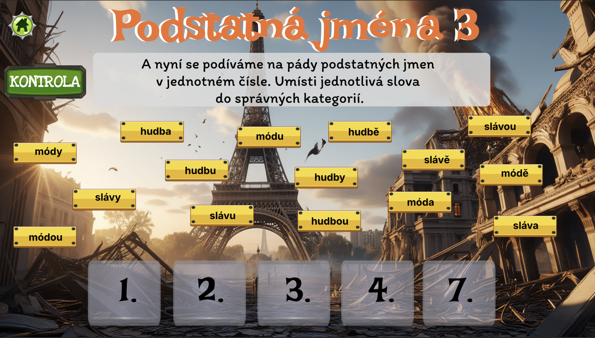 15 slov, které žák rozmísťuje do správné kategorie - 1., 2., 3., 4. a 7. pád. Ve druhém cvičení jsou