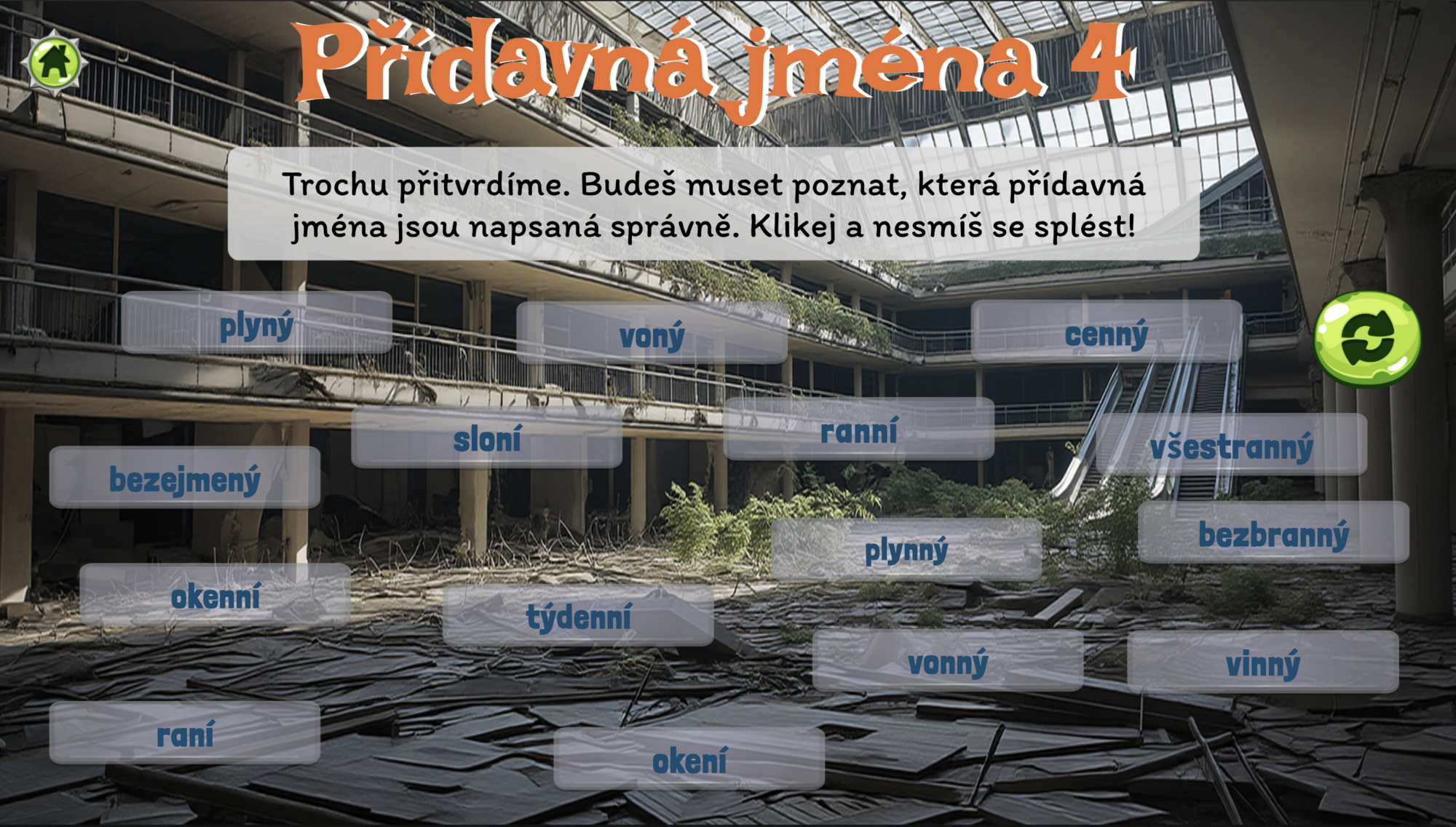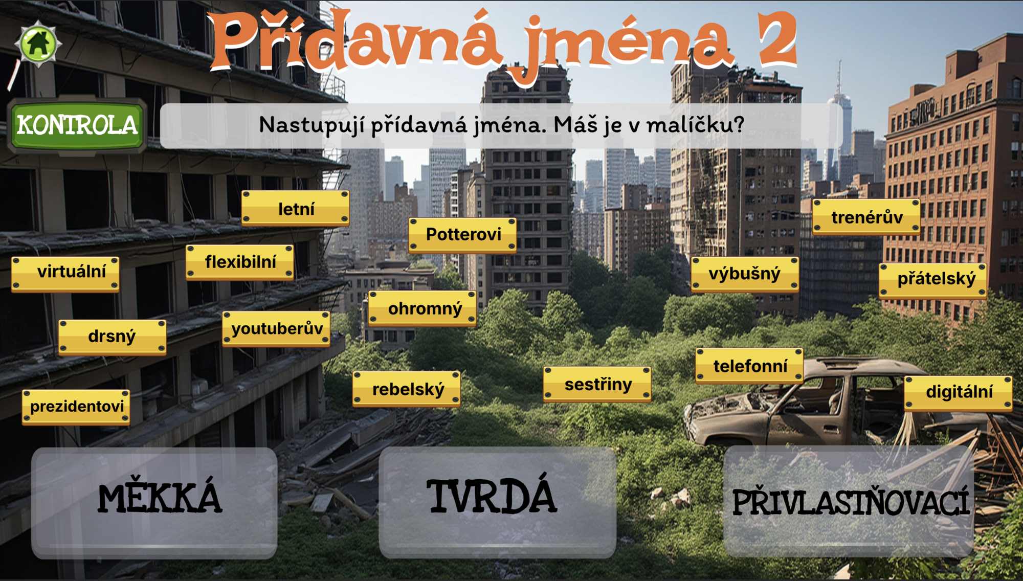 15 slov, žák vybírá a kliká na všechna přídavná jména. Pokud udělá chybu, objeví se záporný GIF,