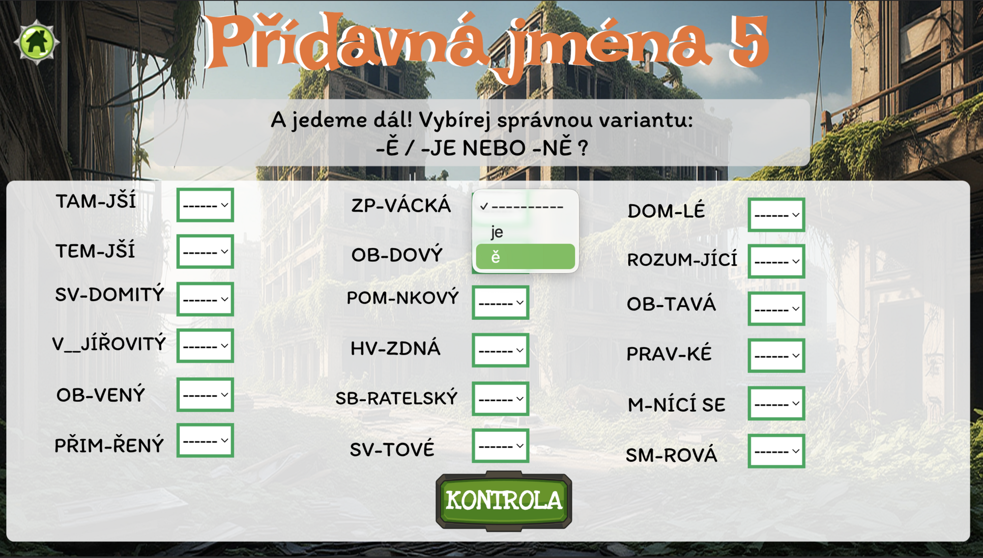 18 slov, žák vybírá správnou variantu z rozbalovací nabídky; po kliknutí na KONTROLA se