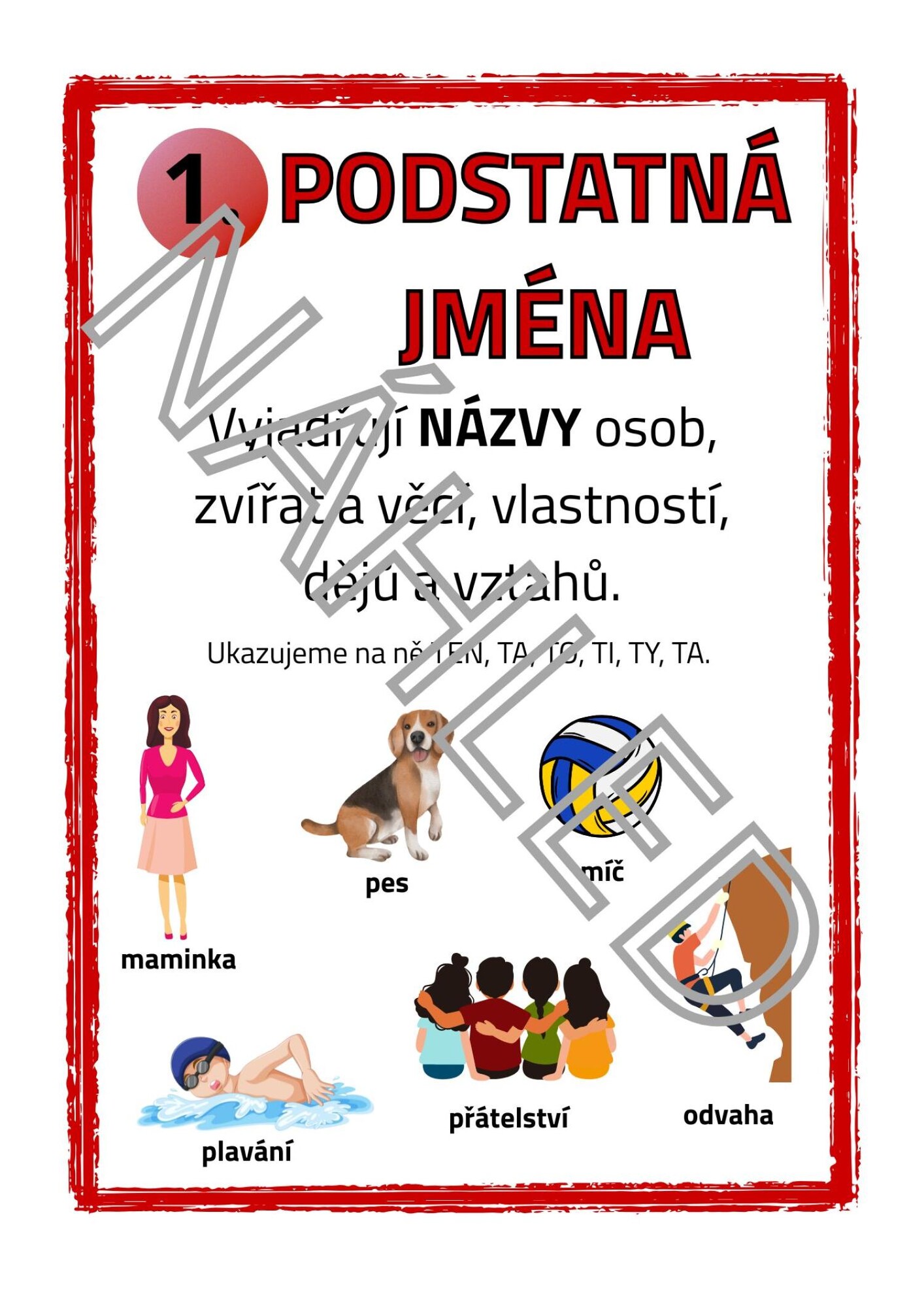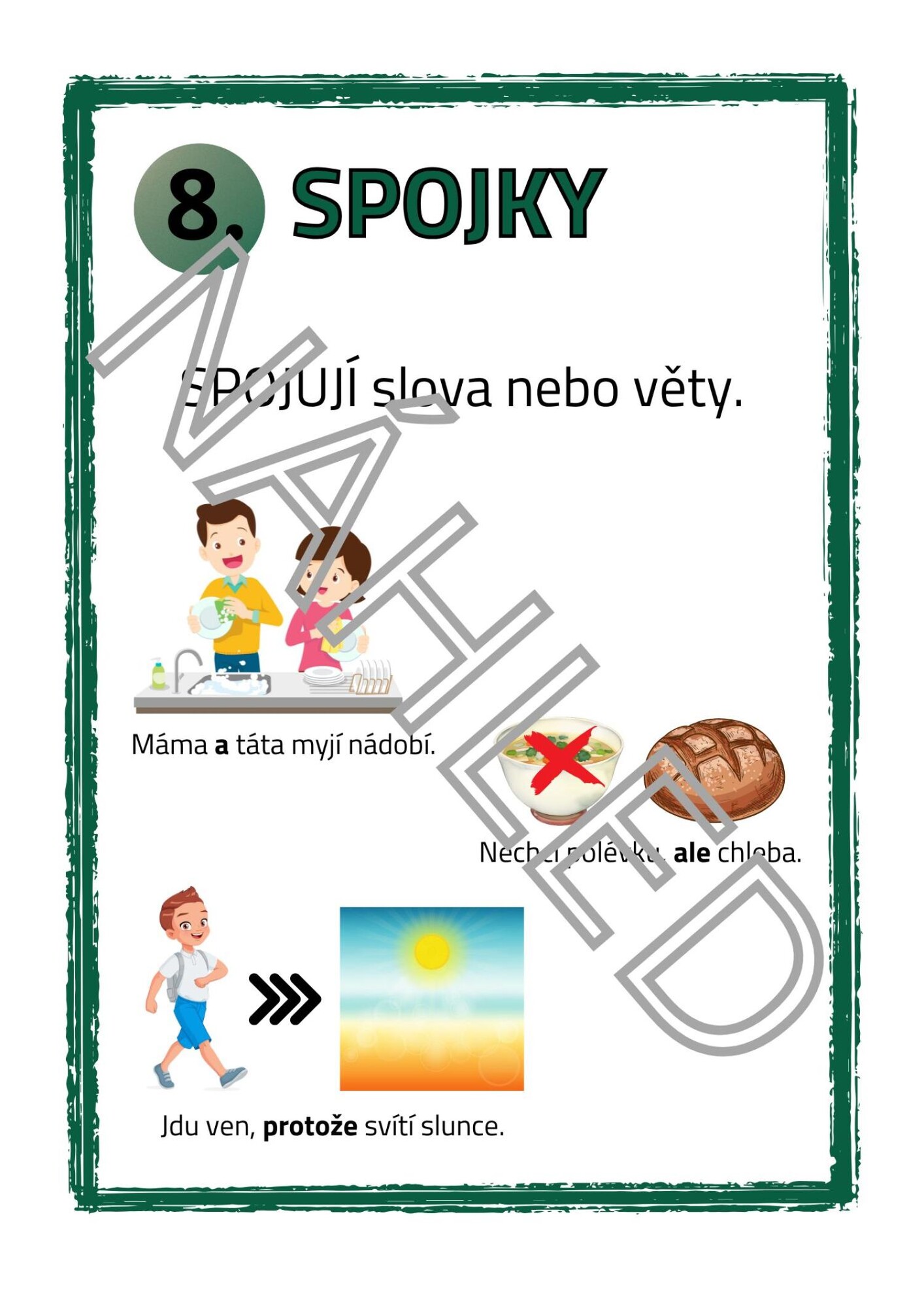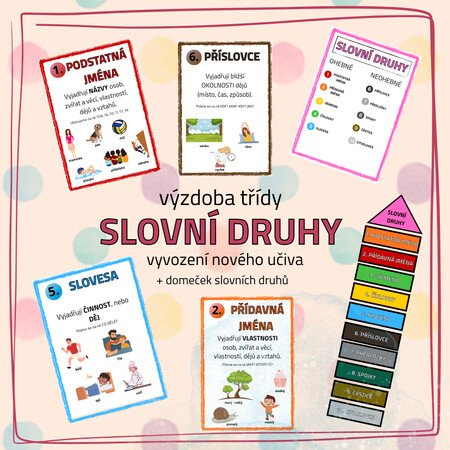 Materiál, který složí k výzdobě třídy, jako pomůcka k vyvození i jako vizuální opora. Součástí je i domeček se seznamem slovních druhů.