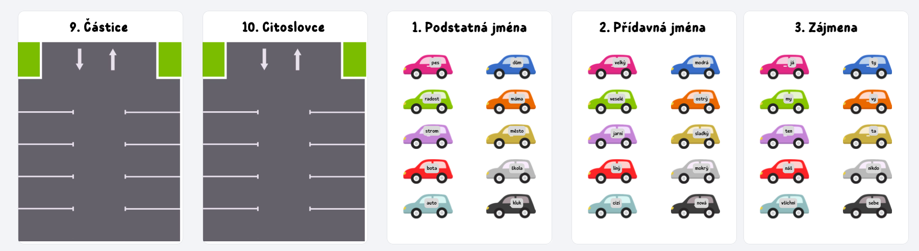 Je to podstatné jméno, nebo snad zájmeno? 🤔 Děti musí aktivně přemýšlet a rozhodovat, což je mnohem zábavnější, než jen tupě kroužkovat text. V balíčku najdete pro každý slovní druh přesně 10 autíček, takže děti mají jasnou motivaci – dokud není v každé garáži plno, práce nekončí! 🏁🏆 Tato manipulace s kartičkami je skvělá pro zapojení svalové paměti a vizuální představivosti, což pomáhá i dětem, které mají s gramatikou běžně trochu potíže. ✨🦾 Celou hru můžete pojmout jako napínavý závod na čas, klidnou samostatnou práci nebo akční běhací hru po třídě, kdy děti rozvážejí „zbloudilá“ autíčka do jejich domovských garáží. 🏃♂️💨