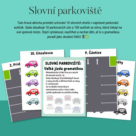 Materiál pokrývá úplně všechno – od jednoduchých slov, která děti znají z běžné řeči, až po záludné spojky, částice nebo citoslovce, která se jim tak často pletou. 🧩🌈 Díky tomu, že je vše připraveno v přehledném PDF, stačí stránky jen vytisknout, zalaminovat a nastříhat. Během chvilky tak máte v ruce profesionální pomůcku, která bude děti bavit a učitelům ušetří spoustu času s vymýšlením příkladů. ✅✂️ Slovní parkoviště je zkrátka jízda, u které se děti učí, aniž by si uvědomovaly, že vlastně dělají gramatiku. Tak nasedat, zapnout pásy a vyrazit vstříc lepším známkám! 🏎️💨🏆