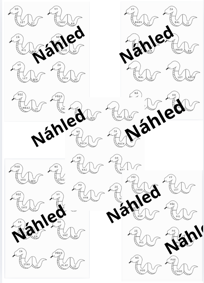 Návod na přípravu: Při přípravě materiálu je potřeba vytisknout všechny listy. Materiál můžete vytisknout černobíle i barevně. Hady a žebříky je potřeba rozstříhat a pro lepší životnost zalaminovat. Každý had má 3 části, je nutné hady na tyto části rozdělit. Při práci s žebříky vymýšlejí žáci nad kořen předponu a pod kořen příponu.