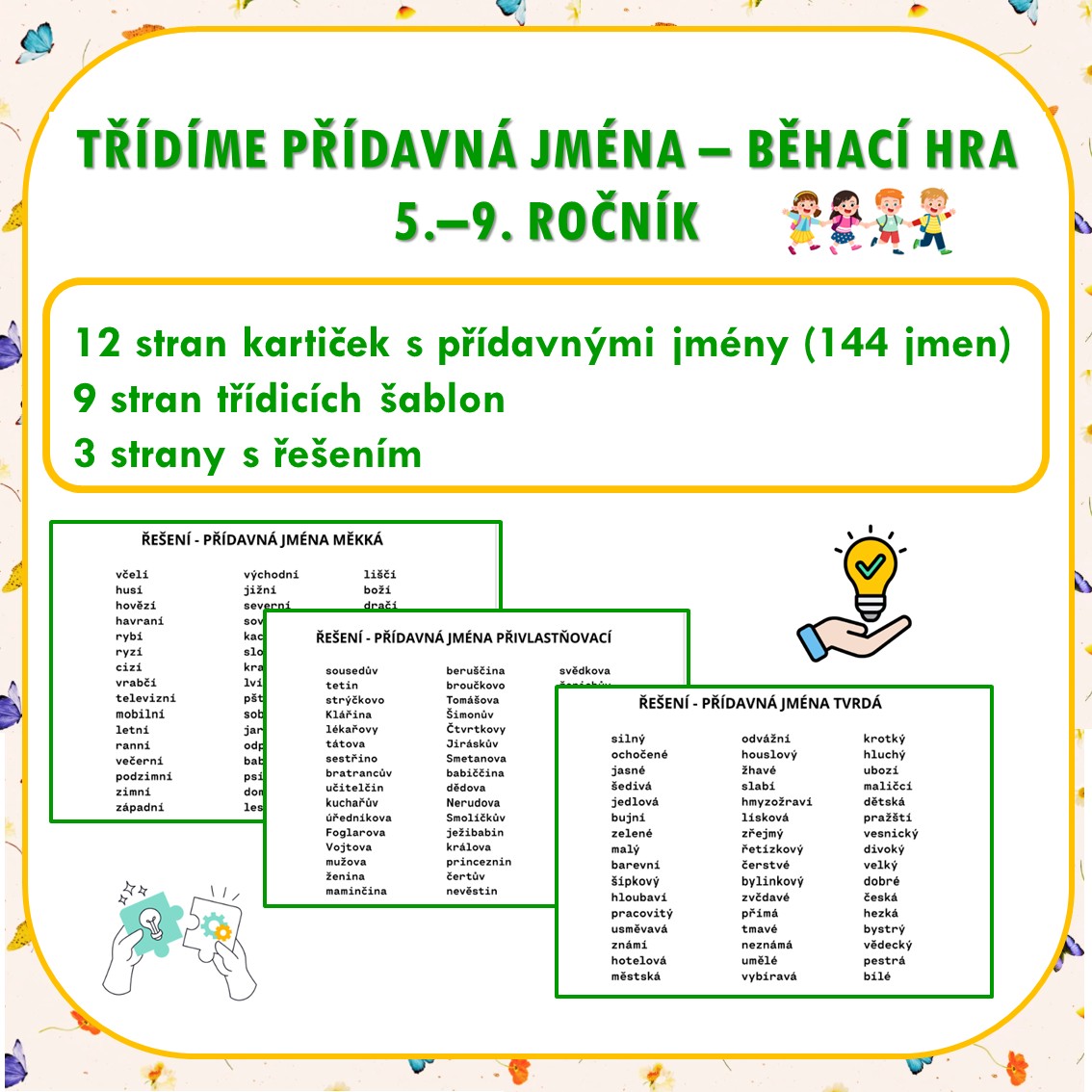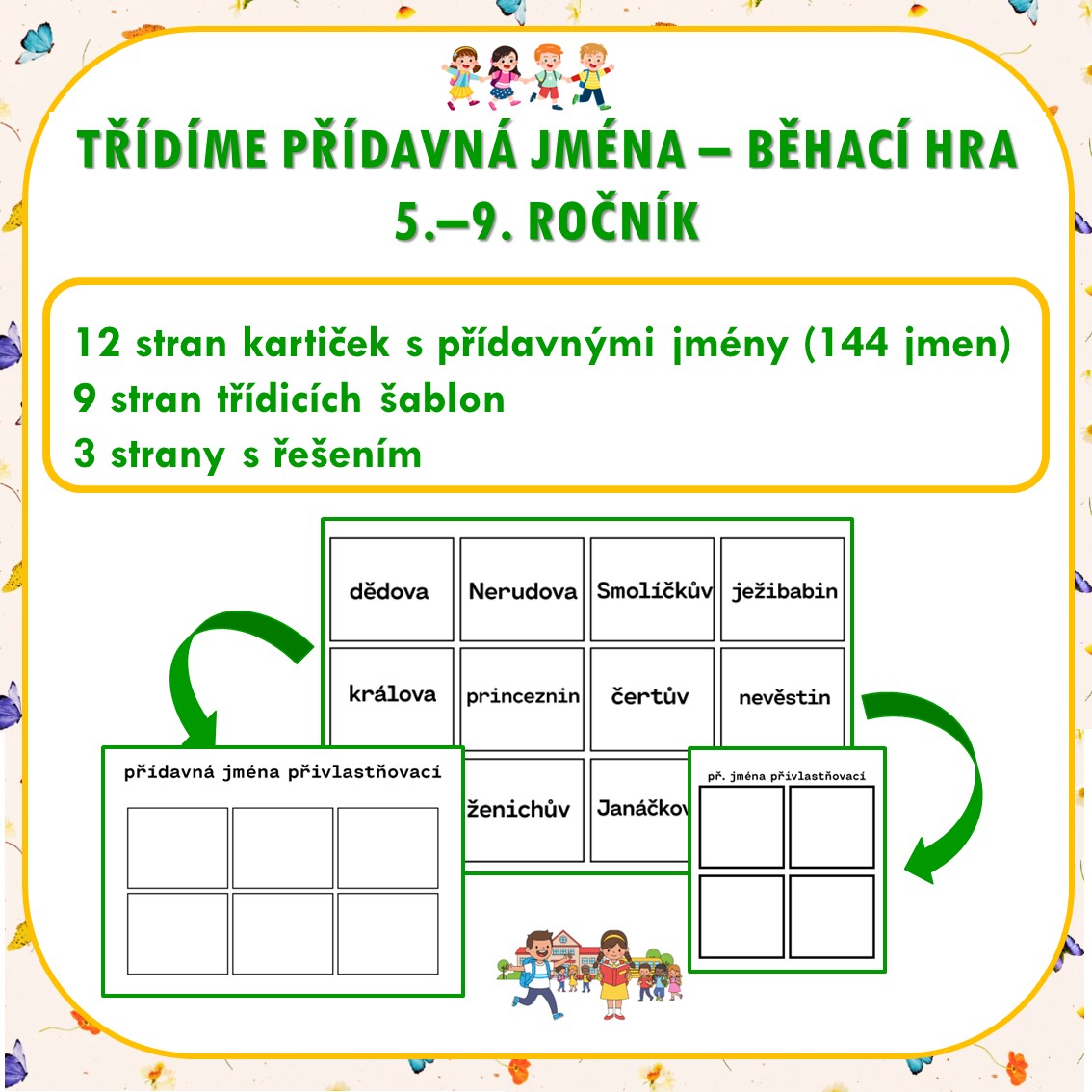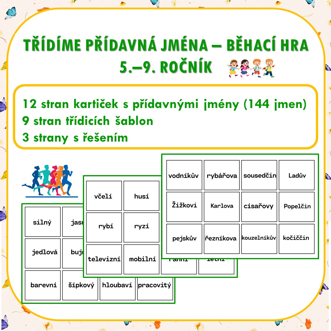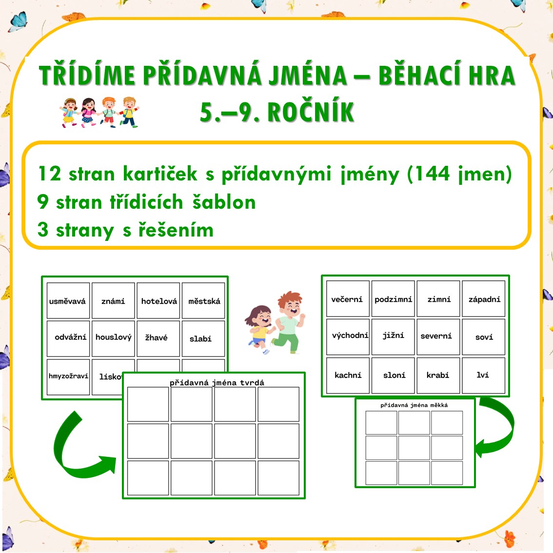 Tato běhací hra přináší 144 přídavných jmen a promění opakování mluvnice v zábavnou soutěž plnou pohybu. Žáci třídí tvrdá, měkká a přivlastňovací přídavná jména, spolupracují v týmu a aktivně si upevňují učivo.