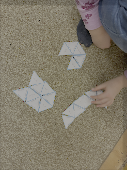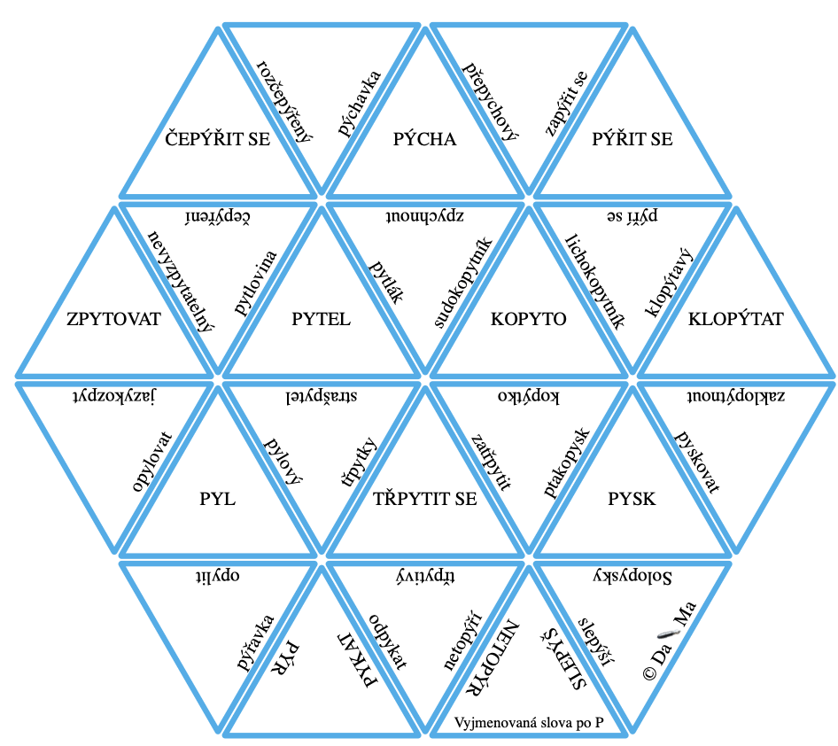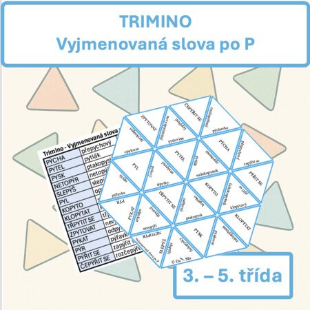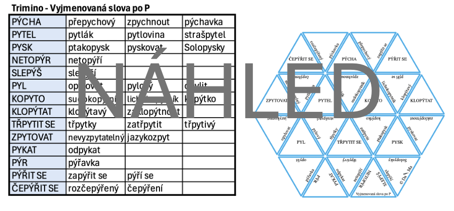 Obsahuje sadu 24 trojúhelníků, které žák skládá to tvaru šestiúhelníku. Součástí materiálu je přehledová tabulka použitých slov pro učitele a náhled řešení finálního tvaru pro kontrolu. Náhled řešení můžete použít jako pomůcku pro žáky s PO. Žáci mají také samokontrolu ve chvíli, kdy složí správný tvar.