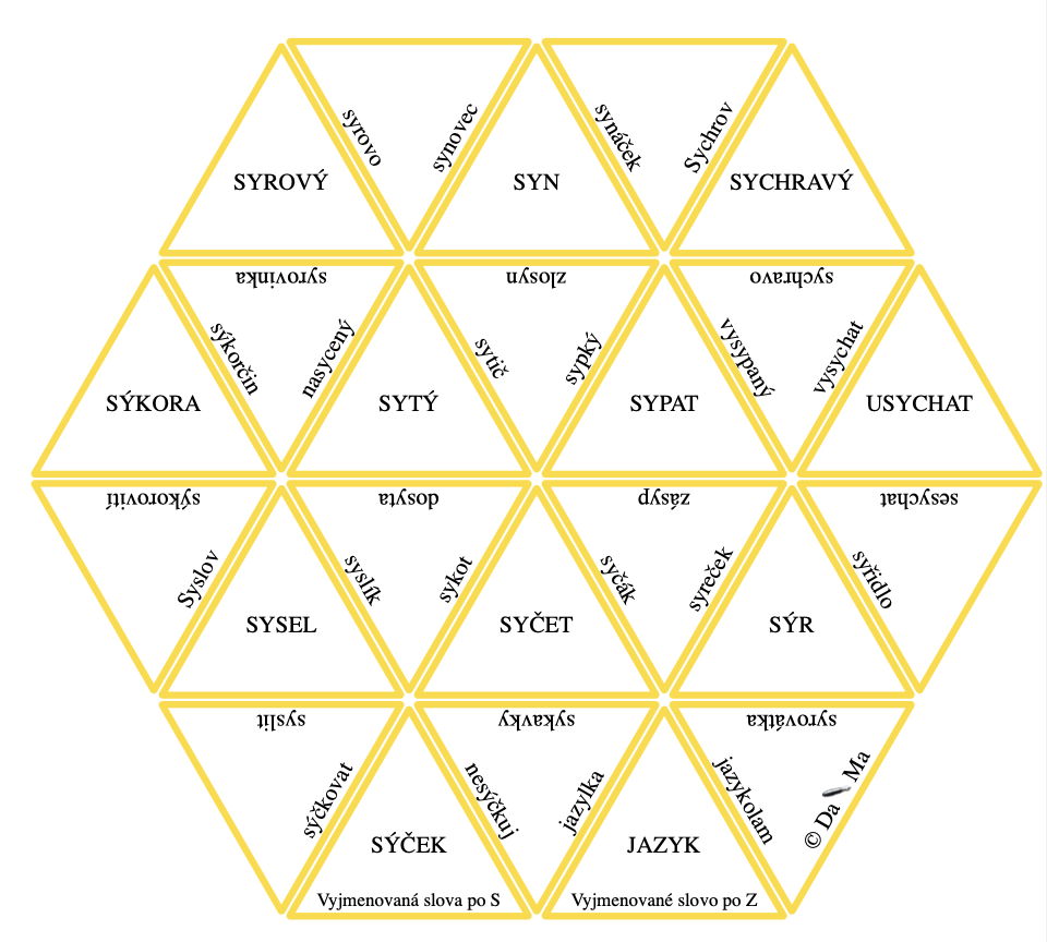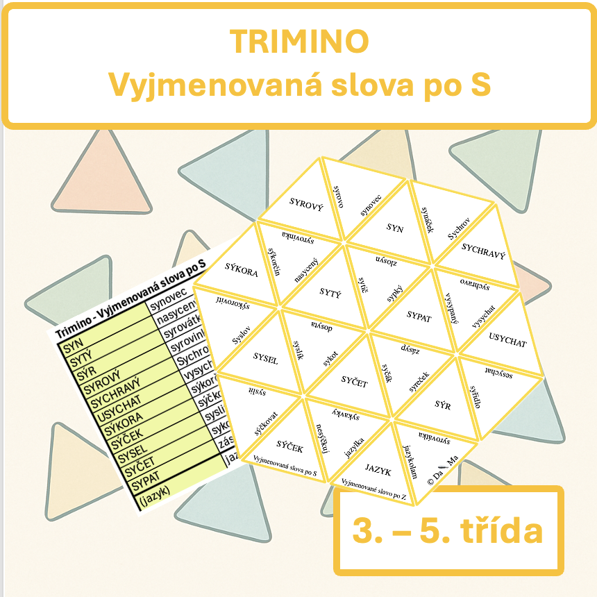 Didaktická hra rozvíjí porozumění vyjmenovaným slovům prostřednictvím praktického procvičování. Žáci si upevňují znalosti vyjmenovaných slov, procvičují kořen slova a k němu slova příbuzná. Hra cvičí pozornost, logiku, slovní zásobu.Tato didaktická aktivita rozvíjí porozumění vyjmenovaným slovům prostřednictvím praktického procvičování. Žáci si nejen upevňují znalosti vyjmenovaných slov, ale zároveň si procvičují kořen slova a k němu slova příbuzná. Hra cvičí pozornost, logiku, soustředěnost a slovní zásobu.Více o produktuMateriál je vytvořen pro předmět český jazyk (mluvnice). Materiál je vhodný pro 3.- 5. třídu.Obsahuje sadu 24 trojúhelníků, které žák skládá to tvaru šestiúhelníku.Součástí materiálu je přehledová tabulka použitých slov pro učitele a náhled řešení finálního tvaru pro kontrolu. Náhled řešení můžete použít jako pomůcku pro žáky s PO. Žáci mají také samokontrolu ve chvíli, kdy složí správný tvar.Hra – žáci skládají požadovaný tvar šestiúhelníku.soutěžní forma – žáci mohou soutěžit, kdo tvar poskládá první.Žáci pracují následujícími způsoby:samostatné skládání triminaskupinová práce – kooperativní způsob práce při tvoření správného tvaru a argumentace vytvoří větu s daným slovem/slovy, zažití slov v praxiCíl materiálu:upevnění znalostí vyjmenovaných slov a slov příbuzných, kořen slovarozvoj gramatického myšlení – žáci analyzují a přiřazují správné tvary slov k soběprocvičení gramatiky v hravé, variabilní podoběuvědomování si významu slov v kontextu větyrozvoj pozornosti, logiky, spolupráce a jazykové pohotovostipodpora diferencované výuky – díky dvěma způsobům využití (samostatná/skupinová práce) máme různé úrovně obtížnosti, učitel může přizpůsobit práci věku a schopnostem žákůMateriál lze použít:jako motivační aktivitujako bleskovku na začátku hodiny – pro upevnění učivapři opakování učivajako mini testík – pro ověření znalostijako krátkou aktivační nebo odlehčující aktivitu během hodinypráce pro rychlíky