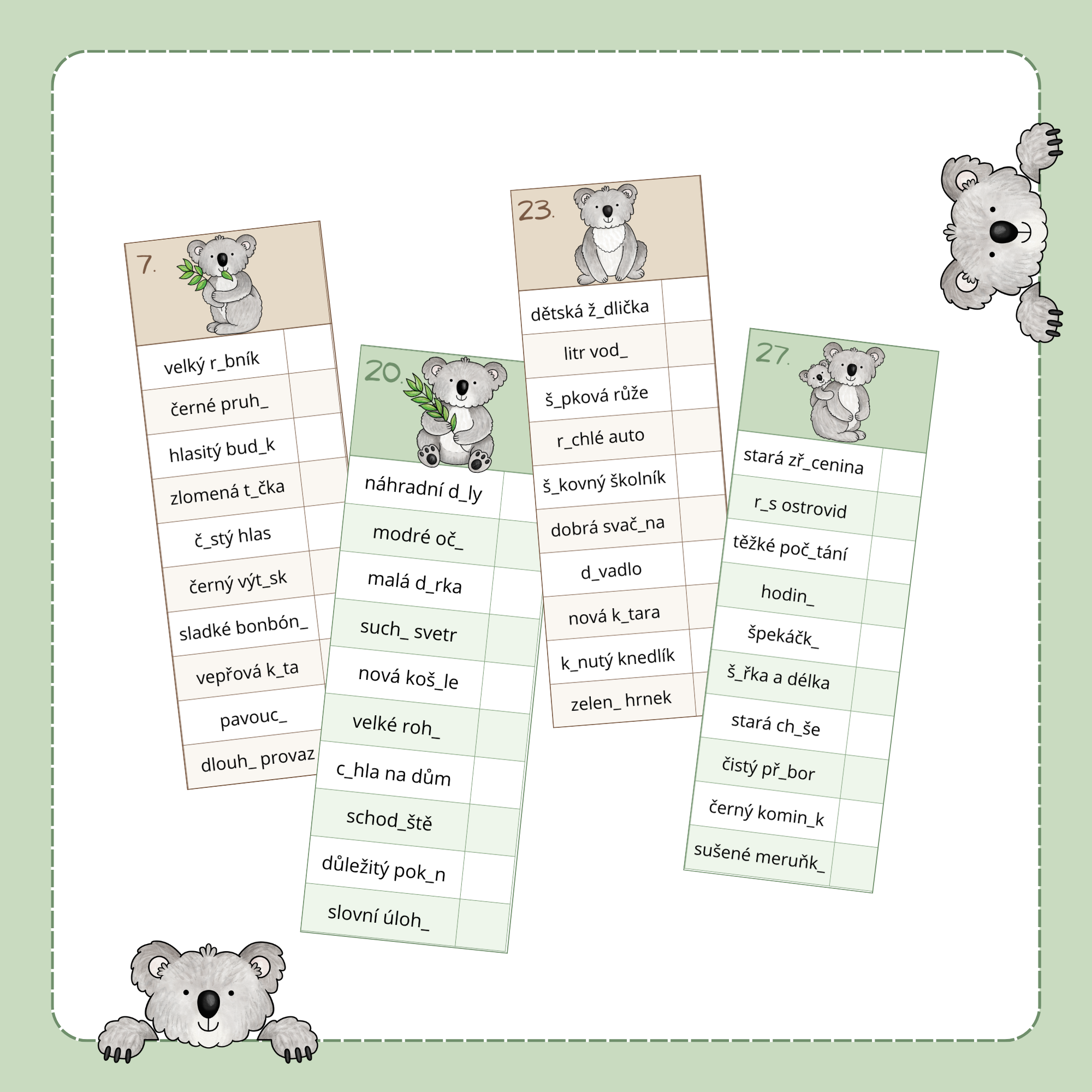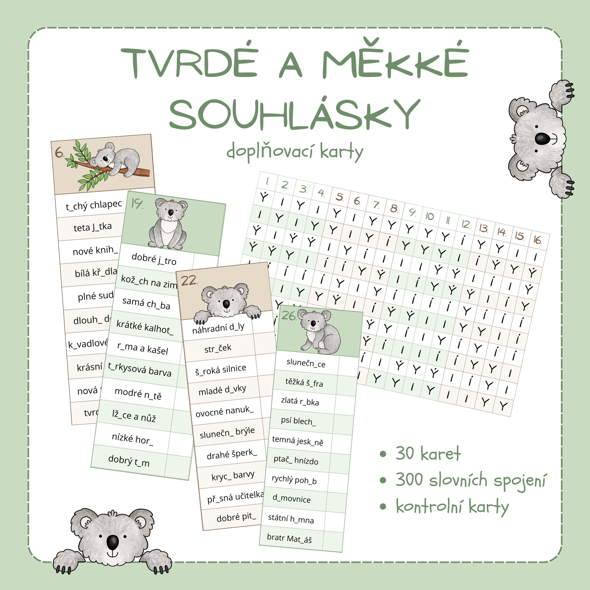 Materiál obsahuje 30 karet, na každé z nich je uvedeno 10 slovních spojení, ve kterých žáci doplňují správnou hlásku (i/í/y/ý).