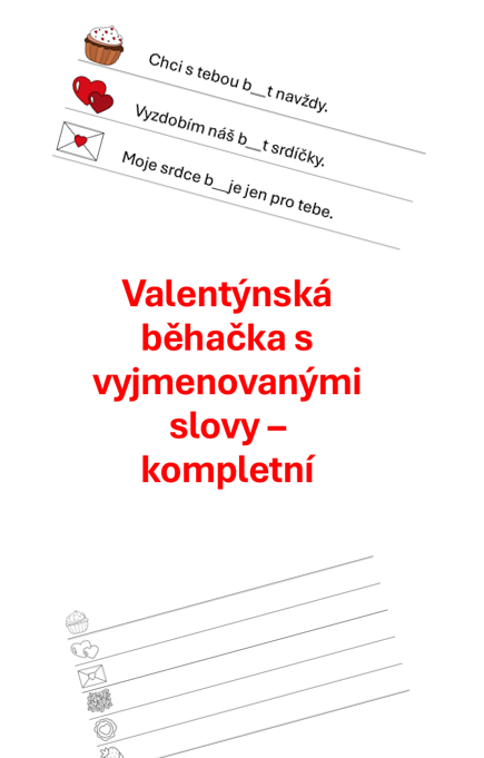 Valentýnská běhačka je pohybová aktivita zaměřená na procvičování vyjmenovaných slov a doplňování i/í, y/ý po obojetných souhláskách. Aktivita je laděna do valentýnského tématu.