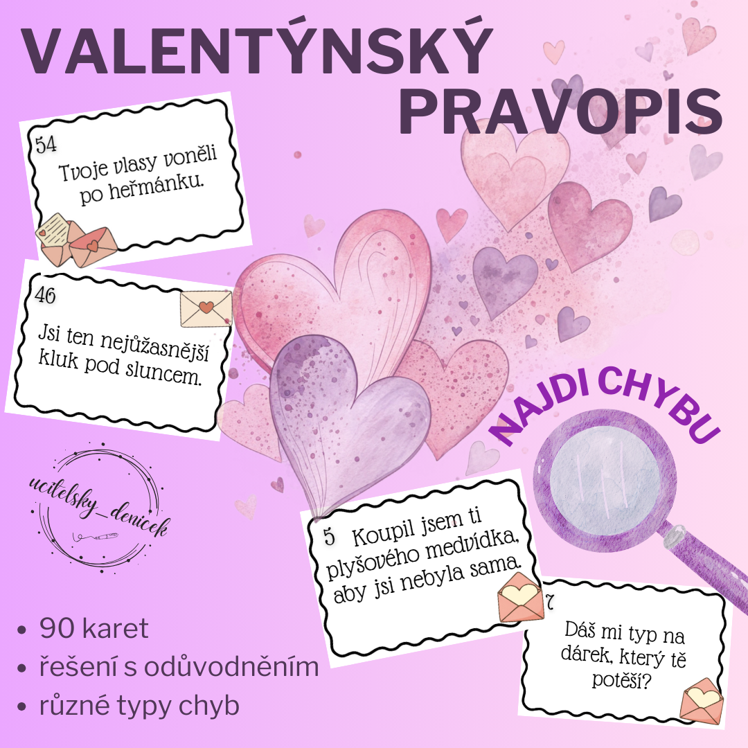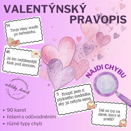 Materiál obsahuje celkem 90 kartiček s větami obsahujícími různé typy pravopisných jevů (i/y po obojetných souhláskách, shoda přísudku s podmětem, velká písmena, psaní s/z, mně/mě, interpunkce, stupňování atd.
