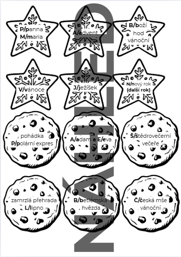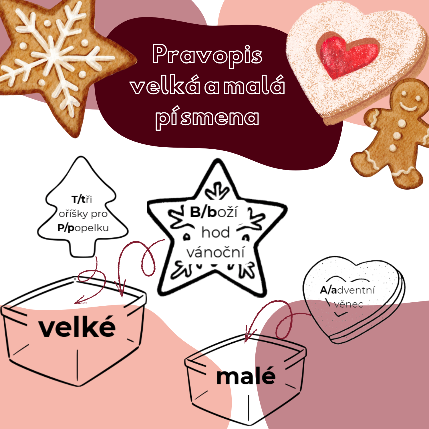 Materiál slouží k třídění cukroví do krabičky podle toho, kde se píše velké a malé písmeno. Lze využít do dvojic na procvičení.