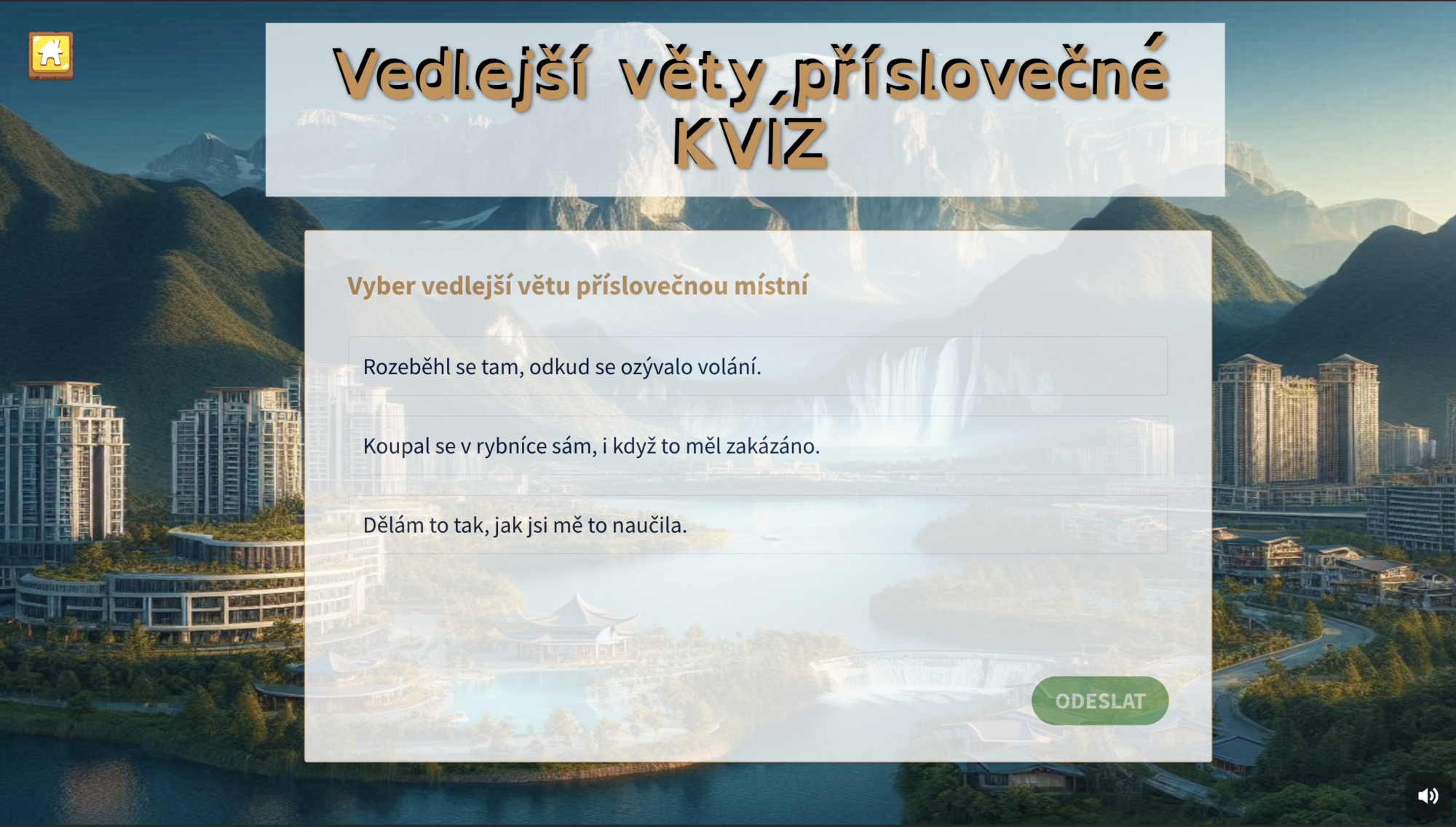 Kvíz obsahuje 16 kvízových otázek. U každé musí zvolit, která odpověď (věta) odpovídá zadání. Vybírá ze 3 možností. Hráč se nemůže posunout dál, dokud neodpoví správně.