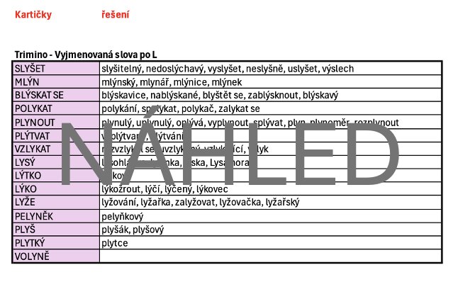 Obsahuje sadu 66 karet se slovy vyjmenovanými a příbuznými.