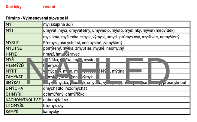 Obsahuje sadu 70 karet se slovy vyjmenovanými a příbuznými.